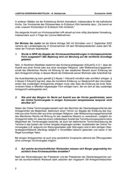 LANDTAG NORDRHEIN-WESTFALEN - 18. Wahlperiode Drucksache 18/842 in Nordrhein-Westfalen und ist nach wie vor von der Größe des jeweiligen Amtsgerichtsbezirks abhängig. Bei kleineren Amtsgerichten beträgt die Wartezeit zwischen einem Tag und wenigen Wochen, wobei teilweise auch ohne Terminvergabe Kirchenaustrittserklärungen entgegengenommen werden. Im Geschäftsbereich eines Oberlandesgerichtsbezirks erhalten die Bürgerinnen und Bürger an den mittelgroßen Amtsgerichten innerhalb von ein bis zwei Monaten einen Termin. Lediglich bei größeren Amtsgerichten beträgt die Wartezeit zwei bis drei Monate. Im Ge- schäftsbereich eines anderen Oberlandesgerichtsbezirks beträgt die durchschnittliche Warte- zeit aktuell insgesamt fünf Wochen. 4. Können jene Bürger, die von diesen ungewöhnlich langen Wartezeiten betroffen sind, mit einer Erstattung ihrer Kirchensteuer rechnen? Die Kirchensteuerpflicht endet nach § 3 Absatz 2 des Gesetzes über die Erhebung von Kir- chensteuern im Land Nordrhein-Westfalen (Kirchensteuergesetz – KiStG NW) bei einem nach Maßgabe der geltenden staatlichen Vorschriften erklärten Kirchenaustritt mit Ablauf des Ka- lendermonats, in dem die Erklärung des Kirchenaustritts wirksam geworden ist. Ein rückwir- kender Eintritt der Wirksamkeit der Erklärung ist gesetzlich nicht vorgesehen. 5. Wie wird von staatlicher Seite sichergestellt, dass auch ältere Personen ohne Zu- gang zum Internet ihren Austritt vollziehen können? Ein Internetzugang ist für die Erklärung eines Kirchenaustritts nicht erforderlich. Bei Amtsge- richten, die über ihren Webauftritt eine Online-Terminbuchung ermöglichen, kann ein Termin alternativ auch telefonisch vereinbart werden. Auf die Antwort zu Frage 1 wird verwiesen. 3