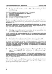 LANDTAG NORDRHEIN-WESTFALEN - 18. Wahlperiode Drucksache 18/834 2. Wie lange dauern die einzelnen Schritte der ZEB der Datenerfassung bis hin zur Berichterstattung? Die ZEB-Kampagne ist in fünf Teilprojekte (TP 0 bis TP 4) unterteilt: TP 0: Vorbereitung der Zustandserfassung und -bewertung TP 1: Erfassung der Ebenheit TP 2: Erfassung der Griffigkeit TP 3: Erfassung der Substanzmerkmale der Oberfläche TP 4: Bewertung und standardisierte Auswertung Zusätzlich wird als ganzheitliche Auswertung für die Landesstraßeninfrastruktur in Nordrhein- Westfalen ein ZEB-Bericht erstellt, in dem die Darstellung des Zustandes der Ingenieurbau- werke ergänzt wird. Auf Grund der verschiedenen Teilschritte, der Abhängigkeiten untereinander und der unter- schiedlichen Auftragnehmer, die koordiniert werden müssen, ist eine allgemeingültige Aus- sage zur Dauer der einzelnen Schritte der ZEB nicht möglich. 3. Welche (ggf. externen) Unternehmen wurden dieses Mal vom Landesbetrieb Stra- ßen.NRW beauftragt, das Straßennetz zu untersuchen? Für die Untersuchung des Straßennetzes wurden der TÜV Rheinland Schniering GmbH, das Ingenieurbüro Feiler und Hänsel, IFI Consult GmbH sowie die Firma Heller Ingenieurgesell- schaft mbH beauftragt. 4. Was wird konkret bei der Zustandserfassung bzw. -bewertung untersucht? Im Rahmen einer ZEB werden die Ebenheit im Längsprofil (Allgemeine Unebenheiten), die Ebenheit im Querprofil (Spurrinnen), die Rauheit (Griffigkeit) und die Substanzmerkmale der Oberflächen (u. a. Risse) als bewertungsrelevante Zustandsgrößen nach den Zusätzlichen Technischen Vertragsbedingungen und Richtlinien zur Zustandserfassung und -bewertung von Straßen (ZTV-ZEB-Stb) erfasst. 5. Wie hoch sind die diesmaligen Gesamtkosten zur Erstellung der Zustandserfas- sung und -bewertung (ZEB)? (Bitte nach internen und externen Kosten aufge- schlüsselt) In Summe wurden 2019 für die ZEB-Kampagne 1.000.044,21 Euro (brutto) an externe Dienst- leister verausgabt (inklusive des zusätzlich zur ZEB-Kampagne erstellten ganzheitlichen Be- richts über den Zustand der Fahrbahnbefestigungen und der Ingenieurbauwerke an Landes- straßen in Nordrhein-Westfalen). Aufgrund der Komplexität und der Beteiligung verschiedener Personalgruppen sowie unter- schiedlicher Softwareprodukte bei der Abwicklung der überjährigen ZEB Kampagnen lassen sich die intern entstandenen Kosten nicht beziffern. 2