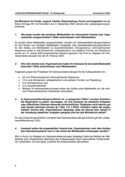 LANDTAG NORDRHEIN-WESTFALEN - 18. Wahlperiode Drucksache 18/823 Die Ministerin für Kinder, Jugend, Familie, Gleichstellung, Flucht und Integration hat die Kleine Anfrage 291 mit Schreiben vom 5. September 2022 namens der Landesregierung be- antwortet. 1. Wie lange wurden die einzelnen Meldestellen für interessierte Vereine bzw. Orga- nisationen ausgeschrieben? (Bitte aufschlüsseln nach Meldestellen) Es wurden keine Meldestellen ausgeschrieben, sondern ein Interessenbekundungsverfahren für den Aufbau von künftigen Meldestellen eingeleitet. Das Interessenbekundungsverfahren für den Aufbau von Meldestellen zu Queerfeindlichkeit, Antiziganismus, antimuslimischem Rassismus sowie zu anti-Schwarzem, antiasiatischem und weiteren Formen von Rassismus wurde am 14. Januar 2022 pressewirksam bekannt gemacht. Die Frist zur Abgabe von Inte- ressensbekundungen war der 25. Februar 2022. 2. Wie viele Vereine bzw. Organisationen haben ihr Interesse für eine jede Meldestelle bekundet? (Bitte aufschlüsseln nach Meldestellen) Insgesamt gingen bis Fristablauf 59 Interessensbekundungen für die Aufbauarbeiten ein; • 22 zum Phänomenbereich antimuslimischer Rassismus, • 13 zu anti-Schwarzem, antiasiatischem und weiteren Formen von Rassismus, • 5 zu Antiziganismus und • 3 zu Queerfeindlichkeit. • Weitere 16 Interessenbekundungen sahen den Aufbau einer Meldestelle vor, die meh- rere Phänomenbereiche miteinander verknüpften. 3. In Interessensbekundungsverfahren ist „in geeigneten Fällen“ privaten Anbietern die Möglichkeit zu geben, darzulegen, ob und inwieweit sie staatliche Aufgaben oder öffentlichen Zwecken dienende (wirtschaftliche) Tätigkeiten nicht ebenso gut oder besser erbringen können (§ 7 Abs. 2 S. 3 BHO). Inwiefern haben die ausge- wählten Vereine bzw. Organisationen dargelegt, dass sie ebenso bzw. besser in der Ausübung staatlicher Aufgaben geeignet sind als das Ministerium selbst? Für das Zuwendungsverfahren und damit das Interessenbekundungsverfahren gilt die Landes- haushaltsordnung (LHO). 4. Inwieweit sollen die ausgewählten Vereine bzw. Organisationen nach dem Aufbau des Datenbanksystems noch in die Arbeit der Meldestellen einbezogen werden? Wie im Aufruf zur Abgabe von Interessensbekundungen dargelegt, bleibt der Betrieb der Mel- destelle nach erfolgreichem Abschluss des Aufbauprojekts einem gesonderten Förderverfah- ren vorbehalten. Es sind daher zunächst die Aufbauarbeiten abzuwarten. 2
