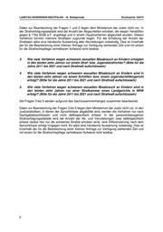 LANDTAG NORDRHEIN-WESTFALEN - 18. Wahlperiode Drucksache 18/673 Daten zur Beantwortung der Fragen 1 und 2 liegen dem Ministerium der Justiz nicht vor. In der Strafverfolgungsstatistik wird die Anzahl der Abgeurteilten erhoben, die wegen Verstößen gegen § 176a StGB a.F. angeklagt und in einem Hauptverfahren abgeurteilt wurden. Diesen Verfahren können mehrere Straftaten zugrunde liegen. Für die Erhebung der Anzahl der Straftaten wäre eine händische Auswertung aller Aburteilungen notwendig. Dies ist innerhalb der für die Beantwortung einer Kleinen Anfrage zur Verfügung stehenden Zeit und mit einem für die Strafrechtspflege vertretbaren Aufwand nicht leistbar. 3. Wie viele Verfahren wegen schwerem sexuellen Missbrauch an Kindern erfolgten in den letzten zehn Jahren vor einem Straf- bzw. Jugendstrafrichter? (Bitte für die Jahre 2011 bis 2021 und nach Strafmaß aufschlüsseln) 4. Wie viele Verfahren wegen schwerem sexuellen Missbrauch an Kindern sind in den letzten zehn Jahren vor einem Schöffen- bzw. einem Jugendschöffengericht erfolgt? (Bitte für die Jahre 2011 bis 2021 und nach Strafmaß aufschlüsseln) 5. Wie viele Verfahren wegen schwerem sexuellen Missbrauch an Kindern sind in den letzten zehn Jahren vor einer Strafkammer eines Landgerichts in NRW erfolgt? (Bitte für die Jahre 2011 bis 2021 und nach Strafmaß aufschlüsseln) Die Fragen 3 bis 5 werden aufgrund des Sachzusammenhanges zusammen beantwortet. Daten zur Beantwortung der Fragen 3 bis 5 liegen dem Ministerium der Justiz nicht vor. In den Justizstatistiken, in denen der Spruchkörper abgebildet wird, werden die Verfahren nur nach Sachgebietsschlüsseln und nicht deliktspezifisch erfasst. In der personenbezogenen Strafverfolgungsstatistik wird die Anzahl der Ab- und Verurteilungen zwar deliktspezifisch erfasst (wobei hier nur die schwerste Straftat erhoben wird), eine Differenzierung nach dem Spruchkörper erfolgt hingegen nicht. Es wäre eine händische Auswertung notwendig. Dies ist innerhalb der für die Beantwortung einer Kleinen Anfrage zur Verfügung stehenden Zeit und mit einem für die Strafrechtspflege vertretbaren Aufwand nicht leistbar. 2