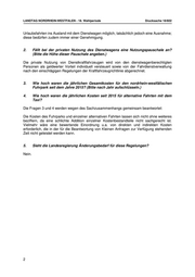 LANDTAG NORDRHEIN-WESTFALEN - 18. Wahlperiode Drucksache 18/602 Urlaubsfahrten ins Ausland mit dem Dienstwagen möglich, tatsächlich jedoch eine Ausnahme; diese bedürfen zudem immer einer Genehmigung. 2. Fällt bei der privaten Nutzung des Dienstwagens eine Nutzungspauschale an? (Bitte die Höhe dieser Pauschale angeben.) Die private Nutzung von Dienstkraftfahrzeugen wird von den dienstwagenberechtigten Personen als geldwerter Vorteil individuell versteuert sowie von der Fahrdienstverwaltung nach den einschlägigen Regelungen der Kraftfahrzeugrichtlinie abgerechnet. 3. Wie hoch waren die jährlichen Gesamtkosten für den nordrhein-westfälischen Fuhrpark seit dem Jahre 2015? (Bitte nach Jahr aufschlüsseln.) 4. Wie hoch waren die jährlichen Kosten seit 2015 für alternative Fahrten mit dem Taxi? Die Fragen 3 und 4 werden wegen des Sachzusammenhangs gemeinsam beantwortet: Die Kosten des Fuhrparks und einzelner alternativen Fahrten lassen sich nicht ohne weiteres beziffern, da eine schlichte Addition einzelner Kostenbestandteile nicht sachgerecht ist. Vielmehr wäre eine bewertende Einordnung u.a. von direkten und indirekten Kosten erforderlich, die in der für die Beantwortung von Kleinen Anfragen zur Verfügung stehenden Zeit nicht geleistet werden kann. 5. Sieht die Landesregierung Änderungsbedarf für diese Regelungen? Nein. 2