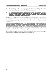 LANDTAG NORDRHEIN-WESTFALEN - 18. Wahlperiode Drucksache 18/651 4. Wie viele bilinguale Masterstudiengänge (z. B. auf Deutsch und Englisch) werden aktuell an Hochschulen in Nordrhein-Westfalen angeboten? 5. Wie viele Masterstudiengänge – ausgenommen Fächer der jeweiligen Literatur- und Sprachwissenschaften – werden aktuell an Hochschulen in Nordrhein- Westfalen in einer anderen Sprache als Deutsch angeboten (bitte aufschlüsseln nach Art der Hochschule, Fach und Sprache)? Die Fragen 4 und 5 werden zusammen auf Grundlage des Hochschulkompasses der Hochschulrektorenkonferenz (https://www.hochschulkompass.de) beantwortet. Die Inhalte im Hochschulkompass unterliegen hochschuleigenen Kriterien und der Pflege durch die Hochschulen. Laut Hochschulkompass gibt es derzeit 2.325 Masterstudiengänge an den Hochschulen in Nordrhein-Westfalen, abzüglich der Lehramtsstudiengänge sind es 1.594. Davon sind 256 Masterstudiengänge (16 %) solche mit einer anderen Hauptunterrichtssprache als Deutsch. Studiengänge der jeweiligen Sprach- und Kulturwissenschaft (Lehramtsstudiengänge sowie Linguistik, Literatur- oder Kulturwissenschaften) wurden nicht berücksichtigt. In der Anlage sind die entsprechenden Masterstudiengänge aufgeführt. Da im Hochschulkompass nur nach der Hauptunterrichtssprache gefiltert werden kann, liegen Informationen zu bilingualen Studiengängen nicht unmittelbar vor. 2