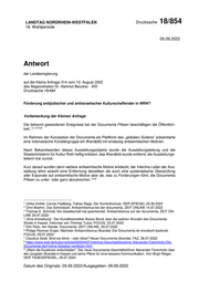 LANDTAG NORDRHEIN-WESTFALEN Drucksache 18/854 18. Wahlperiode 05.09.2022 Antwort der Landesregierung auf die Kleine Anfrage 314 vom 10. August 2022 des Abgeordneten Dr. Hartmut Beucker AfD Drucksache 18/484 Förderung antijüdischer und antiisraelischer Kulturschaffender in NRW? Vorbemerkung der Kleinen Anfrage Die bekannt gewordenen Ereignisse bei der Documenta Fifteen beschäftigen die Öffentlich- 1,2, 3,4,5,6 keit. Im Rahmen der Konzeption der Documenta als Plattform des „globalen Südens“ präsentierte eine indonesische Künstlergruppe ein Wandbild mit eindeutig antisemitischen Motiven. Nach Bekanntwerden dieses Ausstellungsobjekts wurde die Ausstellungsleitung und die Staatsministerin für Kultur Roth heftig kritisiert, das Wandbild wurde entfernt, die Ausstellungs- leiterin trat zurück. Kurz darauf wurden dann weitere antisemitische Motive entdeckt, der Interims-Leiter der Aus- stellung lehnt sowohl eine Entfernung derselben als auch eine systematische Überprüfung aller Exponate auf antisemitische Motive aber ab, was zu Forderungen führt, die Documenta 7,8,9 Fifteen zu unter- oder ganz abzubrechen. 1 Ulrike Knöfel, Carola Padtberg, Tobias Rapp, Der Kontrollverlust, DER SPIEGEL 25.06.2022 2 Omri Boehm, Das Schreiduell. Antisemitismus bei der documenta, ZEIT ONLINE 14.07.2022 3 Thomas E. Schmidt, Die Gesellschaft hat geantwortet. Antisemitismus auf der documenta, ZEIT ON- LINE 20.07.2022 4 „Eine Anmaßung“. Der Kunsttheoretiker Bazon Brock über die wahren Wurzeln des Documenta- Streits in Kassel. Interview von Thomas Tuma, FOCUS, 23.07.2022 5 Dirk Peitz, Am Rande. Documenta, ZEIT ONLINE, 29.07.2022 6 Philipp Peyman Engel, Nächster Antisemitismus-Skandal: Die Documenta ist moralisch bankrott, FOCUS, 29.07.2022 7 Claudius Seidl, Sind sie blind – oder böse? Neuer Documenta-Skandal, FAZ, 28.07.2022 8 https://www.welt.de/kultur/article240034437/Interims-Geschaeftsfuehrer-Alexander-Farenholtz-Die- Documenta-darf-keine-Gesetze-verletzen.html 9 „Allein die Kuratoren entscheiden“. Der neue Documenta-Geschäftsführer Alexander Farenholtz über den jüngsten Skandal in Kassel und seine Pläne für eine bessere Kommunikation. Von Birgit Rieger, DER TAGESSPIEGEL, 29.07.2022 Datum des Originals: 05.09.2022/Ausgegeben: 09.09.2022