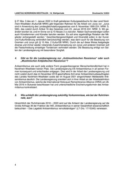 LANDTAG NORDRHEIN-WESTFALEN - 18. Wahlperiode Drucksache 18/854 § 27 Abs. 3 des am 1. Januar 2022 in Kraft getretenen Kulturgesetzbuchs für das Land Nord- rhein-Westfalen (KulturGB NRW) gibt folgenden Rahmen für die Arbeit von Jurys vor: „Jurys sind in Anwendung des Landesgleichstellungsgesetzes vom 9. November 1999 (GV. NRW. S. 590), das zuletzt durch Artikel 16 des Gesetzes vom 23. Januar 2018 (GV. NRW. S. 90) ge- ändert worden ist, und im Sinne von § 10 Absatz 2 zu berufen. Neben Sachverständigen sollen auch Künstlerinnen und Künstler berufen werden. Es soll eine regelmäßige Rotation der Mit- glieder sichergestellt werden.“ Geschlechtergerechtigkeit und Diversität sollen in der Kunst- und Kulturförderung verbindlich berücksichtigt werden, was dann auch für die Besetzung von Gremien und Jurys gilt (§ 10 Abs. 2 KulturGB NRW). Durch die auf diese Weise festgelegte diverse und immer wieder rotierende Zusammensetzung von Jurys und anderen Gremien soll die Festschreibung einseitiger Tendenzen verhindert werden. Die Besetzung erfolgt von Sei- ten der Landesregierung mit besonderer Sorgfalt. 4. Gibt es für die Landesregierung nur „Antimuslimischen Rassismus“ oder auch „Muslimischen Antijüdischen Rassismus“? Antisemitismus wie auch jede andere Form gruppenbezogener Menschenfeindlichkeit hat in Nordrhein-Westfalen keinen Platz. Die Landesregierung tritt Antisemitismus in all seinen For- men konsequent und entschieden entgegen. Dies wird in der Arbeit der Landesregierung und nicht zuletzt durch das im November 2018 geschaffene Amt einer Antisemitismusbeauftragten des Landes Nordrhein-Westfalen sowie der im August 2021 eingerichteten Meldestelle Anti- semitismus deutlich. Die Landesregierung orientiert sich in ihrer Arbeit an der Arbeitsdefinition von Antisemitismus, welche die International Holocaust Remembrance Alliance (IHRA) am 26. Mai 2016 in Bukarest beschlossen hat und unterschiedliche Erscheinungsformen des Antise- mitismus konkretisiert. 5. Wie schließt die Landesregierung zukünftig Vorkommnisse, wie bei der Ruhrtrien- nale, aus? Hinsichtlich der Ruhrtriennale 2018 – 2020 wird auf die Antwort der Landesregierung auf die Große Anfrage 36 der Fraktion der AfD „Antisemitismus in seiner Gesamtheit wissenschaftlich beleuchten – Das Lagebild Antisemitismus vervollständigen“ (LT-Drs. 17/15345) verwiesen. 4