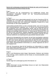 Namens der Landesregierung beantwortet der Minister der Justiz und für Europa und Verbraucherschutz die Kleine Anfrage wie folgt: Frage 1: Wie positioniert sich die Landesregierung zum großflächigen Einsatz oben beschriebener Ersatzstoffe? Werden z.B. alle Verbraucherschutzinteressen vollumfänglich gewahrt? zu Frage 1: Aspartam (E 951) ist ein Lebensmittelzusatzstoff, der nach der Verordnung (EG) Nr. 1333/2008 vom 16.12.2008 über Lebensmittelzusatzstoffe als Süßungsmittel für brennwertverminderte oder ohne Zuckerzusatz hergestellte Produkte bis zu einer Höchstmenge von 800 mg/kg zugelassen ist. Lebensmittelzusatzstoffe dürfen nur dann verwendet werden, wenn sie für den jewei- ligen Verwendungszweck zugelassen sind. Im Rahmen des Zulassungsverfahrens der Europäischen Union muss nachgewiesen werden, dass der Stoff auf seine ge- sundheitliche Unbedenklichkeit überprüft wurde, die Verwendung technologisch not- wendig ist, die jeweilige Anwendung nicht zur Täuschung der Verbraucher führt und der Stoff EU-weit verbindlichen, detailliert festgelegten Reinheitsanforderungen ent- spricht. Alle zugelassenen Zusatzstoffe sind durch verschiedene nationale und inter- nationale Institutionen und Expertengremien gesundheitlich bewertet worden. Isoglucose ist demgegenüber eine Zuckerart, die als Zutat verschiedenen Lebensmit- teln zugesetzt wird. Es handelt sich nicht um einen zulassungspflichtigen Zusatzstoff. Für alle in den Verkehr gebrachten Lebensmittel gilt, dass sie sicher sein müssen. Verantwortlich dafür ist der Lebensmittelunternehmer. Es liegen der Landesregierung keine validen wissenschaftlichen Erkenntnisse vor, wonach Isoglucose als nicht si- cher eingestuft wird. Unter der Voraussetzung, dass bei der Herstellung von Lebensmitteln nur zugelas- sene Lebensmittelzusatzstoffe und sichere Lebensmittelzutaten verwendet werden, ist der Verbraucherschutz gewährleistet. Frage 2: Sind im Land Brandenburg bisher Klagen, Beschwerden, Petitionen oder ähnliche Dinge anhängig, welche ursächlich auf den Einsatz von Zuckerersatzstoffen zurück zu führen sind? zu Frage 2: Darüber liegen der Landesregierung keine Informationen vor. Frage 3: Welche „Warnungen“ vor dem übermäßigen Genuss von Light,- bzw. Diätprodukten wird für angemessen erachtet?