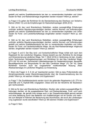 Landtag Brandenburg Drucksache 6/8288 gestellt und welche Qualitätsstandards bei den zu verwendenden Asphalten und Unter- bauten für Rad- und Radwanderwege eingehalten werden müssen? Wenn ja, welche? zu Frage 4: Es gelten die Richtlinien für die Standardisierung des Oberbaus von Verkehrs- flächen (RStO 12) und die Empfehlungen für Radverkehrsanlagen (ERA 2010). 5. Gibt es für das Land Brandenburg Statistiken, andere aussagkräftige Erhebungen und/oder amtliche Bauplanungsunterlagen darüber, welche Normen und Anforderungen gestellt und welche Qualitätsstandards bei den zu verwendenden Asphalten und Unter- bauten für Forst- und Landwirtschaftswege eingehalten werden müssen? Wenn ja, wel- che? 6. Gibt es für das Land Brandenburg Statistiken, andere aussagkräftige Erhebungen und/oder amtliche Bauplanungsunterlagen darüber, welche Normen und Anforderungen gestellt und welche Qualitätsstandards bei den zu verwendenden Asphalten und Unter- bauten für Forst- und landwirtschaftliche Wege, die als Rad-Radwanderwege mitgenutzt werden, eingehalten werden müssen? Wenn ja, welche? zu Fragen 5 und 6: Der Bau land- und forstwirtschaftlicher Wege richtet sich nach dem Regelwerk für den Ländlichen Wegebau. Dieses besteht aus der „Richtlinie für die Anlage und Dimensionierung Ländlicher Wege, Teil 1“ (RLW 2016) in Verbindung mit den „Zusätz- lichen Technischen Vertragsbedingungen und Richtlinien für den Bau Ländlicher Wege“ (ZTV LW 16) und den „Technischen Lieferbedingungen für Gesteinskörnungen, Baustoffe, Baustoffgemische und Bauprodukte für den Bau Ländlicher Wege“ (TL LW 16). Diese Richtlinien kommen auch bei vorgesehener multifunktionaler Nutzung (Rad- /Radwanderwege) im Ländlichen Wegebau zur Anwendung. 7, Wenn die Fragen 4, 5, 6 mit „ja“ beantwortet wurden: Gibt es dazu Prüfprotokolle oder Abnahmeprotokolle sowie Überprüfungsprotokolle über die Zusammensetzung des As- phalts? Wenn ja, mit welchen Inhalten und Ergebnissen? zu Frage 7: Die Qualitätsstandards werden durch die geltenden Regelwerke (z.B. ZTV As- phalt-StB und TL Asphalt-StB) vorgegeben. Diese sind bei der Abnahme der Bauleistun- gen nachzuweisen. 8. Gibt es für das Land Brandenburg Statistiken, Studien oder andere aussagekräftige Er- hebungen darüber, ob die ausgewiesenen Rad- und Radwanderwege, Forst -und Land- wirtschaftswege, die gemäß ihrer Anlage auch in der Doppelfunktionalität genutzt werden und einer Belastung durch das Befahren von Kraftfahrzeugen mit 44 Tonnen und mehr - wie zum Beispiel im Rahmen der Beräumung des Sturmholzes, die durch die Landesregie- rung zugelassen wurde standhalten? Wenn ja: Mit welchen Inhalten und Ergebnissen? zu Frage 8: Nein. -2-