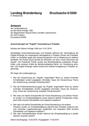 Landtag Brandenburg Drucksache 6/3500 6. Wahlperiode Antwort der Landesregierung auf die Kleine Anfrage 1369 der Abgeordneten Steeven Bretz und Björn Lakenmacher der CDU-Fraktion Drucksache 6/3336 Ausschreitungen bei "PogIdA"-Veranstaltung in Potsdam Wortlaut der Kleinen Anfrage 1369 vom 14.01.2016: Gewalttätige Auseinandersetzungen und Krawalle während der Veranstaltung der Pegida-Anhänger am vergangenen Montagabend in Potsdam führten laut Pressebe- richten zu Verstößen gegen das Versammlungsrecht und zur Begehung von weiteren Straftaten. Die Polizei spricht gemäß den Berichten von einer „neuen Dimension der Gewalt“. Die Potsdamer Polizei musste laut Berichterstattung zusätzliche Einsatz- kräfte, unter anderem Kräfte der Bereitschaftspolizei Berlin, zur Verstärkung anfor- dern. Die Pegida-Anhänger haben bereits eine nächste Kundgebung in Potsdam an- gekündigt. Wir fragen die Landesregierung: 1. War die Versammlung der „PogIdA“ angemeldet? Wenn ja, welche konkreten Anmeldedaten wurden angegeben (Anmelder, Dauer der Versammlung, Thema der Versammlung, erwartete Teilnehmerzahl)? 2. War die Protestversammlung gegen die „PogIdA“ angemeldet? Wenn ja, welche konkreten Anmeldedaten wurden angegeben (Anmelder, Dauer der Versamm- lung, Thema der Versammlung, erwartete Teilnehmerzahl)? 3. Wie viele und welche Einsatzkräfte der Polizei Brandenburg und anderer Polizei- en wurden zur Einsatzbewältigung vorab aufgrund welcher Erwägungen einge- plant (bitte einzelne Dienststellen und insgesamt angeben)? 4. Wie viele und welche Einsatzkräfte der Polizei Brandenburg und anderer Polizeien wurden zur Einsatzbewältigung während des Einsatzes aufgrund wel- cher konkreten Lagebeurteilungen angefordert und eingesetzt (bitte einzelne Dienststellen und insgesamt angeben)? 5. Wie viele Polizeibedienstete wurden während der Einsatzbewältigung in jeweils welchem Ausmaß verletzt?