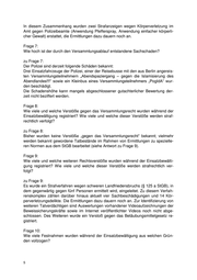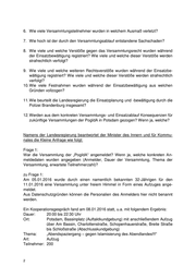 6. Wie viele Versammlungsteilnehmer wurden in welchem Ausmaß verletzt? 7. Wie hoch ist der durch den Versammlungsablauf entstandene Sachschaden? 8. Wie viele und welche Verstöße gegen das Versammlungsrecht wurden während der Einsatzbewältigung registriert? Wie viele und welche dieser Verstöße werden strafrechtlich verfolgt? 9. Wie viele und welche weiteren Rechtsverstöße wurden während der Einsatzbe- wältigung registriert? Wie viele und welche dieser Verstöße werden strafrechtlich verfolgt? 10. Wie viele Festnahmen wurden während der Einsatzbewältigung aus welchen Gründen vollzogen? 11. Wie beurteilt die Landesregierung die Einsatzplanung und -bewältigung durch die Polizei Brandenburg insgesamt? 12. Werden aus dem konkreten Versammlungs- und Einsatzablauf Konsequenzen für zukünftige Versammlungen der PogIdA in Potsdam gezogen? Wenn ja, welche? Namens der Landesregierung beantwortet der Minister des Innern und für Kommu- nales die Kleine Anfrage wie folgt: Frage 1: War die Versammlung der „PogIdA“ angemeldet? Wenn ja, welche konkreten An- meldedaten wurden angegeben (Anmelder, Dauer der Versammlung, Thema der Versammlung, erwartete Teilnehmerzahl)? zu Frage 1: Am 05.01.2016 wurde durch einen namentlich bekannten 32-Jährigen für den 11.01.2016 eine Versammlung unter freiem Himmel in Form eines Aufzuges ange- meldet. Aus Datenschutzgründen können die Personalien des Anmelders hier nicht benannt werden. Ein Kooperationsgespräch fand am 08.01.2016 statt, u.a. mit folgendem Ergebnis: Dauer: 20:00 bis 22:30 Uhr Ort: Potsdam, Bassinplatz (Auftaktkundgebung) mit anschließendem Aufzug über Am Bassin, Charlottenstraße, Schopenhauerstraße, Breite Straße bis Schloßstraße (Abschlusskundgebung) Thema: „Abendspaziergang – gegen Islamisierung des Abendlandes!!!“ Art: Aufzug Teilnehmer: 200