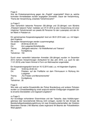 Frage 2: War die Protestversammlung gegen die „PogIdA“ angemeldet? Wenn ja, welche konkreten Anmeldedaten wurden angegeben (Anmelder, Dauer der Versammlung, Thema der Versammlung, erwartete Teilnehmerzahl)? zu Frage 2: Zwei namentlich bekannte Personen (58-Jährige und 33-Jähriger) vom Bündnis „Potsdam! bekennt Farbe“ meldeten am 07.01.2016 je eine Versammlung mit einer möglichen Teilnehmerzahl von jeweils 80 Personen für den Luisenplatz und den Al- ten Markt in Potsdam an. Ein gemeinsames Kooperationsgespräch fand am 08.01.2016 statt, u.a. mit folgen- dem Ergebnis: Die beiden Versammlungen werden zusammengelegt. Dauer 20:00 bis 22:30 Uhr Ort: Am Lustgarten/Schloßstraße; Thema: „Refugees welcome – für Weltoffenheit und Toleranz“ Art: Kundgebung Teilnehmer: 150 Durch einen namentlich bekannten Anmelder (59-Jähriger) wurden im Dezember 2015 mehrere Versammlungen (fortlaufend für das Jahr 2016, u.a. auch für den 11.01.2016) unter freiem Himmel in Form von Mahnwachen angemeldet. Ein Kooperationsgespräch fand am 16.12.2015 statt, u.a. mit folgendem Ergebnis: Dauer: 18:00 bis 20:00 Uhr Ort: Potsdam, auf der Freifläche vor dem Filmmuseum in Richtung Am Lustgarten Thema: „Für Frieden und Menschenrechte“ Art: Kundgebung Teilnehmer: 30 Frage 3: Wie viele und welche Einsatzkräfte der Polizei Brandenburg und anderer Polizeien wurden zur Einsatzbewältigung vorab aufgrund welcher Erwägungen eingeplant (bit- te einzelne Dienststellen und insgesamt angeben)? zu Frage 3: Auf Grundlage vorhandener Erkenntnisse und der Tatsache, dass Aufklärungser- gebnisse über bevorstehende Störung nicht vorlagen, wurden für den Einsatz die Bereitschaftspolizeiabteilungsführung mit zwei Einsatzhundertschaften der Direktion Besondere Dienste (198 Beamte) sowie ergänzend 64 Beamte der Polizeidirektion West geplant.