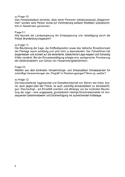 zu Frage 10: Das Polizeipräsidium berichtet, dass keine Personen (strafprozessual) „festgenom- men“ wurden; eine Person wurde zur Verhinderung weiterer Straftaten (polizeirecht- lich) in Gewahrsam genommen. Frage 11: Wie beurteilt die Landesregierung die Einsatzplanung und -bewältigung durch die Polizei Brandenburg insgesamt? zu Frage 11: Die Beurteilung der Lage, die Kräftedisposition sowie das taktische Einsatzkonzept der Planlage waren schlüssig und sind nicht zu beanstanden. Der Polizeiführer hat angemessen und schnell auf die veränderte, tatsächliche Lage reagiert und frühzeitig Kräfte verstärkt. Bei der Einsatzbewältigung erfolgte eine sachgerechte Priorisierung der Gefahrenabwehr zum Schutz von Versammlungsteilnehmern. Frage 12: Werden aus dem konkreten Versammlungs- und Einsatzablauf Konsequenzen für zukünftige Versammlungen der „PogIdA“ in Potsdam gezogen? Wenn ja, welche? zu Frage 12: Die festzustellende Aggressivität und Gewaltbereitschaft von Störern der linken Sze- ne, auch gegen-über der Polizei, ist auch zukünftig einsatztaktisch zu berücksichti- gen. Dies bedingt – am Einzelfall orientiert und abhängig von der konkreten Beurtei- lung der Lage – eine angepasste, grundsätzlich niedrige Einschreitschwelle mit kon- sequenter Gefahrenabwehr und Strafverfolgung mit ausreichender Kräftelage.