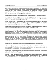 Landtag Brandenburg Drucksache 6/10219 rund um den Themenbereich Sozialhilfe ist beim Landesamt für Soziales und Versorgung (LASV) ein Fachdienst eingerichtet worden. Dieser bietet den Kommunen fachliche Hilfe- stellung bei der Lösung konkreter Fragestellungen an. Dort wurde auch eine Orientie- rungshilfe für die Gewährung von Leistungen der „67er-Hilfen“ erarbeitet, die im Februar 2017 den Kommunen an die Hand gegeben worden ist. Frage 3: Welche Verbände / Akteure sind in der Obdachlosenhilfe in Brandenburg aktiv? Frage 5: Wie ist die aktuelle Situation der Notunterkünfte? (Anzahl, Ort, Trägerschaft, per- sonelle und sächliche Ausstattung, Auslastung)? zu den Fragen 3 und 5: In Anbetracht der Zuständigkeit der Kommunen für die Vermei- dung von Obdachlosigkeit und Gewährleistung von Wohnungsnotfallhilfe im Einzelfall kann die Landesregierung hierzu keine Auskünfte geben. Frage 4: Welche konkreten Maßnahmen zur Vermeidung bzw. Beendigung von Obdachlo- sigkeit werden im Land Brandenburg umgesetzt bzw. sind in Planung? zu Frage 4: Die Landesregierung betreibt soziale Wohnraumförderung zugunsten der Be- völkerungsgruppen, die sich ohne staatliche Unterstützung nicht mit angemessenem Wohnraum versorgen können. Ein Haushalt kann unterstützt werden, wenn seine Mittel und Möglichkeiten nicht ausreichen, sich angemessen mit Wohnraum zu versorgen. Dadurch wird Obdachlosigkeit verhindert und abgeholfen. Mithilfe der Wohnraumförderung des Landes wurden seit 1991 über 163.000 Wohnungen neu geschaffen oder moderni- siert. Hierzu wurden durch die Investitionsbank des Landes Brandenburg Zuschüsse und Darlehen von ca. 5,6 Milliarden Euro zugesagt, um die Städte und Gemeinden bei der Schaffung und dem Erhalt von mietpreis- und belegungsgebundenem Wohnraum zu un- terstützen. Frage 6: Ist eine landesweite Wohnungsnotfallstatistik in Planung oder umsetzbar? zu Frage 6: Die Landesregierung unterstützt, wie auch von der Arbeits- und Sozialminis- terkonferenz 2017 in Potsdam beschlossen, die Aktivitäten der Bundesregierung für die Einführung einer bundesweiten Wohnungslosenstatistik. Frage 7: Gibt es einen Masterplan des Landes bezüglich des Umgangs mit Obdachlosig- keit oder ist ein solcher in Planung? zu Frage 7: Unter Berücksichtigung der Aufgaben- und Zuständigkeitsaufteilung zwischen Land und Kommunen im fraglichen Bereich gibt es keinen Masterplan der Landesregie- rung bezüglich des Umgangs mit Obdachlosigkeit, noch ist ein solcher in Planung. -2-