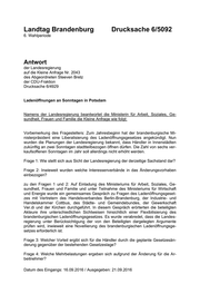 Landtag Brandenburg Drucksache 6/5092 6. Wahlperiode Antwort der Landesregierung auf die Kleine Anfrage Nr. 2043 des Abgeordneten Steeven Bretz der CDU-Fraktion Drucksache 6/4929 Ladenöffnungen an Sonntagen in Potsdam Namens der Landesregierung beantwortet die Ministerin für Arbeit, Soziales, Ge- sundheit, Frauen und Familie die Kleine Anfrage wie folgt: Vorbemerkung des Fragestellers: Zum Jahresbeginn hat der brandenburgische Mi- nisterpräsident eine Liberalisierung des Ladenöffnungsgesetzes angekündigt. Nun wurden die Planungen der Landesregierung bekannt, dass Händler in Innenstädten zukünftig an zwei Sonntagen stadtteilbezogen öffnen dürfen. Die Zahl von sechs ver- kaufsoffenen Sonntagen im Jahr soll allerdings nicht erhöht werden. Frage 1: Wie stellt sich aus Sicht der Landesregierung der derzeitige Sachstand dar? Frage 2: Inwieweit wurden welche Interessenverbände in das Änderungsvorhaben einbezogen? zu den Fragen 1 und 2: Auf Einladung des Ministeriums für Arbeit, Soziales, Ge- sundheit, Frauen und Familie und unter Teilnahme des Ministeriums für Wirtschaft und Energie wurde ein gemeinsames Gespräch zu Fragen des Ladenöffnungsgeset- zes mit Vertretern des Handelsverbandes Berlin-Brandenburg, der Industrie- und Handelskammer Cottbus, des Städte- und Gemeindebundes, der Gewerkschaft Ver.di und der Kirchen durchgeführt. In diesem Gespräch erörterten die beteiligten Akteure ihre unterschiedlichen Sichtweisen hinsichtlich einer Flexibilisierung des brandenburgischen Ladenöffnungsgesetzes. Es wurde verabredet, dass die Landes- regierung unter Berücksichtigung der von den Beteiligten dargelegten Argumente prüfen wird, inwieweit eine Novellierung des brandenburgischen Ladenöffnungsge- setzes erforderlich ist. Frage 3: Welcher Vorteil ergibt sich für die Händler durch die geplante Gesetzesän- derung gegenüber der bestehenden Gesetzeslage? Frage 4: Welche Mehrbelastungen ergeben sich aufgrund der Änderung für die Ar- beitnehmer? Datum des Eingangs: 16.09.2016 / Ausgegeben: 21.09.2016