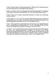 Frage 5: Welche weiteren Gesetzesänderungen in Bezug auf die Ladenöffnungszei- ten am Sonntag hält die Landesregierung für denkbar? Frage 6: Inwieweit plant die Landesregierung Ausnahmeregelungen für inhaberge- führte Läden in historischen Innenstädten, z.B. in der Landeshauptstadt Potsdam? Frage 8: Wann ist mit welchen Gesetzesänderungen von Seiten der Landesregie- rung zu rechnen? zu den Fragen 3, 4, 5, 6 und 8: Der politische Willensbildungsprozess innerhalb der Landesregierung zu der Frage, inwieweit eine Änderung des brandenburgischen La- denöffnungsgesetzes erforderlich ist, ist noch nicht abgeschlossen. Frage 7: Wie bewertet die Landesregierung eine Verkürzung der Tagesöffnungszei- ten an verkaufsoffenen Sonntagen (jetzt 13 – 20 Uhr, siehe BbgLöG §5) und statt- dessen eine Erweiterung der offenen Sonntage von sechs auf acht? zu Frage 7: Jede eventuelle Änderung des brandenburgischen Ladenöffnungsgeset- zes muss die verfassungsrechtlichen Vorgaben zur Wahrung eines Regel- Ausnahme-Verhältnisses beachten und darf unter Beachtung des Beschlusses des OVG Berlin-Brandenburg vom 26.03.2015 insgesamt nicht zu einer unzulässigen Ausweitung der möglichen Ladenöffnungen an Sonn- und Feiertagen führen.