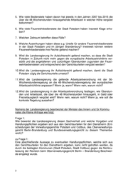 Frage 8: Welche Auswirkungen haben diese o.g. Urteile für andere Feuerwehrbedienstete in der Stadt Potsdam und im übrigen Brandenburg? Inwieweit können weitere Feuer- wehrbedienstete ihre Rechte geltend machen? zu Frage 8: Aufgrund der Revision der Städte Cottbus und Potsdam gegen die Urteile des Ober- verwaltungsgerichtes Berlin – Brandenburg kann derzeit keine Aussage über mögli- che Auswirkungen für weitere Bedienstete in der Stadt Potsdam und im übrigen Land Brandenburg getroffen werden. Frage 9: Wird die Landesregierung ihr Aufsichtsrecht geltend machen, so dass die Stadt Potsdam in Zukunft nicht mehr gegen die europäische Arbeitszeitrichtlinie verstößt und die angefallenen und zukünftigen Überstunden zugunsten der Feuerwehrbe- diensteten und entsprechend den Gerichtsurteilen vergütet werden? zu Frage 9: Seitens der Landesregierung wird es derzeit als nicht notwendig erachtet, aufsichts- rechtliche Maßnahmen hinsichtlich der Anwendung der Verordnung über die Arbeits- zeit für die Beamten des Polizeivollzugsdienstes, des feuerwehrtechnischen Dienstes und des Justizvollzugsdienstes des Landes Brandenburg (Brandenburgische Ar- beitszeitverordnung Polizei, Feuerwehr, Justizvollzug – BbgAZVPFJ) bzw. der Abgel- tung der Überstunden zu ergreifen. Frage 10: Wird die Landesregierung ihr Aufsichtsrecht geltend machen, damit die Stadt Pots- dam zügig die Gerichtsurteile umsetzt? zu Frage 10: Siehe Antwort zu Frage 9. Frage 11: Wird die Landesregierung die geltende Arbeitszeitverordnung mit der 56- Wochenstundenregelung an die 48-Wochenstundenregelung der europäischen Ar- beitszeitrichtlinie anpassen? Wenn ja, wann? Wenn nein, warum nicht? zu Frage 11: Bereits mit Verordnung vom 10. Juli 2014 wurde die BbgAZVPFJ angepasst. Frage 12: Wird die Landesregierung in der Arbeitszeitverordnung festlegen, wie Überstunden und Arbeitszeit, die über die 48 Wochenstunden hinausgeht, in Geld oder Freizeit- ausgleich vergütet wird? Wenn nein, warum nicht? Wenn ja, wie soll die konkrete Regelung aussehen? zu Frage 12: Eine Festlegung wie die Überstunden und Arbeitszeit, welche über die wöchentliche Arbeitszeit von 48 Stunden hinausgehen, abgegolten werden soll, wird nicht durch die Brandenburgische Arbeitszeitverordnung Polizei, Feuerwehr, Justizvollzug gere- gelt. Dies liegt in der alleinigen Zuständigkeit der einzelnen Dienstherrn.