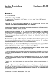Landtag Brandenburg Drucksache 6/8453 6. Wahlperiode Antwort der Landesregierung auf die Kleine Anfrage Nr. 3372 der Abgeordneten Thomas Jung (AfD-Fraktion) und Franz Josef Wiese (AfD-Fraktion) Drucksache 6/8258 Nachfrage zur Antwort der Landesregierung auf die Kleine Anfrage Nummer 3250 „Beratung durch Verbraucherschutzzentrale in 15 Sprachen“ Namens der Landesregierung beantwortet der Minister der Justiz und für Europa und Ver- braucherschutz die Kleine Anfrage wie folgt: Vorbemerkung der Fragesteller: Auf die Frage vier der Kleinen Anfrage 3250 „Beratung durch Verbraucherschutzzentralen in 15 Sprachen“ wurde lediglich allgemein dahingehend geantwortet, dass grundsätzlich Entgelte zu zahlen seien. Hierdurch ergibt sich, dass auch Ausnahmen bestehen. Zudem existiert auf der Webseite der VZB keine Position für Dol- metscherkosten. Zur Vorbemerkung: Wenn Verbraucherinnen und Verbraucher eine Beratungsleistung der Verbraucherzentrale Brandenburg (VZB) in Anspruch nehmen, bezahlen sie Beratungs- entgelte unabhängig von ihrer Herkunft und ihrer Lebenssituation. Frage 1: Wurden von den beratenen Flüchtlingen auch tatsächlich Beratungspauschalen und sonstige Gebühren wie zum Beispiel Dolmetscherkosten gezahlt? Die geflüchteten Menschen, die in den Beratungsstellen der VZB beraten wurden, haben Beratungsentgelte entsprechend der Entgelttabelle bezahlt. Für den Einsatz des Telefondolmetscherdienstes in der Beratung entstehen Verbrauche- rinnen und Verbrauchern während der Laufzeit des Projektes bis Ende 2018 keine zusätz- lichen Kosten. Frage 2: Wenn ja: Richteten sich diese Entgelte ausschließlich nach der auf der Webseite der VZB veröffentlichten Übersicht, oder gibt es weitere Gebührentatbestände für Dolmet- scherkosten? Frage 3: Wenn nein: Warum wurde kein separates Entgelt für Dolmetscherleistungen er- hoben? zu Frage 3: Zum einen sollen alle Verbraucherinnen und Verbraucher in Brandenburg die Beratung der VZB gleichermaßen in Anspruch nehmen können. Dabei ist im Einzelfall eine Sprachmittlung nötig, um qualitätsgesichert beraten zu können und um Zugangsbarrieren zur Beratung abzubauen. Eingegangen: 21.03.2018 / Ausgegeben: 27.03.2018