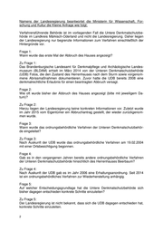 Namens der Landesregierung beantwortet die Ministerin für Wissenschaft, For- schung und Kultur die Kleine Anfrage wie folgt: Verfahrensführende Behörde ist im vorliegenden Fall die Untere Denkmalschutzbe- hörde im Landkreis Märkisch-Oderland und nicht die Landesregierung. Daher liegen der Landesregierung nur begrenzte Informationen zum Verfahren einschließlich der Hintergründe vor. Frage 1: Wann wurde das erste Mal der Abbruch des Hauses angezeigt? Zu Frage 1: Das Brandenburgische Landesamt für Denkmalpflege und Archäologische Landes- museum (BLDAM) erhielt im März 2014 von der Unteren Denkmalschutzbehörde (UDB) Fotos, die den Zustand des Herrenhauses nach dem Sturm sowie vorgenom- mene Abrissmaßnahmen dokumentieren. Zuvor hatte die UDB bereits 2008 eine denkmalrechtliche Erlaubnis für einen beantragten Abbruch versagt. Frage 2: Wie oft wurde bisher der Abbruch des Hauses angezeigt (bitte mit jeweiligem Da- tum)? Zu Frage 2: Hierzu liegen der Landesregierung keine konkreten Informationen vor. Zuletzt wurde im Jahr 2015 vom Eigentümer ein Abbruchantrag gestellt, der wieder zurückgenom- men wurde. Frage 3: Wann wurde das ordnungsbehördliche Verfahren der Unteren Denkmalschutzbehör- de eingeleitet? Zu Frage 3: Nach Auskunft der UDB wurde das ordnungsbehördliche Verfahren am 19.02.2004 mit einer Ortsbesichtigung begonnen. Frage 4: Gab es in den vergangenen Jahren bereits andere ordnungsbehördliche Verfahren der Unteren Denkmalschutzbehörde hinsichtlich des Herrenhauses Beerbaum? Zu Frage 4: Nach Auskunft der UDB gab es im Jahr 2006 eine Erhaltungsanordnung. Seit 2014 ist ein ordnungsbehördliches Verfahren zur Wiederherstellung anhängig. Frage 5: Auf welcher Entscheidungsgrundlage hat die Untere Denkmalschutzbehörde sich bisher dagegen entschieden konkrete Schritte einzuleiten? Zu Frage 5: Der Landesregierung ist nicht bekannt, dass sich die UDB dagegen entschieden hat, konkrete Schritte einzuleiten.