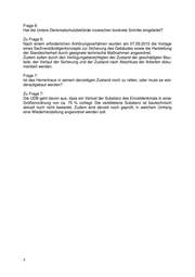 Frage 6: Hat die Untere Denkmalschutzbehörde inzwischen konkrete Schritte eingeleitet? Zu Frage 6: Nach einem erforderlichen Anhörungsverfahren wurden am 07.09.2015 die Vorlage eines Sachverständigenkonzepts zur Sicherung des Gebäudes sowie die Herstellung der Standsicherheit durch geeignete technische Maßnahmen angeordnet. Zudem sollen durch den Verfügungsberechtigten der Zustand der geschädigten Bau- teile, der Verlauf der Sicherung und der Zustand nach Abschluss der Arbeiten doku- mentiert werden. Frage 7: Ist das Herrenhaus in seinem derzeitigen Zustand noch zu retten, oder muss es wie- deraufgebaut werden? Zu Frage 7: Die UDB geht davon aus, dass ein Verlust der Substanz des Einzeldenkmals in einer Größenordnung von ca. 75 % vorliegt. Die verbliebene Substanz ist bautechnisch aktuell noch nicht bewertet. Zudem wird derzeit noch geprüft, in welchem Umfang eine Wiederherstellung angeordnet werden soll.