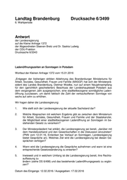 Landtag Brandenburg Drucksache 6/3499 6. Wahlperiode Antwort der Landesregierung auf die Kleine Anfrage 1372 der Abgeordneten Steeven Bretz und Dr. Saskia Ludwig der CDU-Fraktion Drucksache 6/3343 Ladenöffnungszeiten an Sonntagen in Potsdam Wortlaut der Kleinen Anfrage 1372 vom 15.01.2016 „Entgegen der bisherigen strikten Ablehnung des Brandenburger Ministeriums für Arbeit, Soziales, Gesundheit, Frauen und Familie (MASGF) hat sich der Ministerprä- sident des Landes Brandenburg, Dietmar Woidke, nun auf einem Neujahrsempfang für den (gerichtlich gescheiterten) Beschluss der Landeshauptstadt Potsdam aus dem vergangenen Jahr ausgesprochen, eine stadtteilbezogene sonntägliche Laden- öffnung zuzulassen, um damit faktisch die Zahl der verkaufsoffenen Sonntage von sechs auf zehn zu erhöhen. Wir fragen daher die Landesregierung: 1. Wie stellt sich der Landesregierung der aktuelle Sachstand dar? 2. Welche Absprachen mit welchem Ergebnis gibt es zwischen dem Ministerium für Arbeit, Soziales, Gesundheit, Frauen und Familie und der Staatskanzlei, die Möglichkeit einer stadtteilbezogenen Ladenöffnung an Sonntagen im be- stehenden Gesetz zu verankern? 3. Der Ministerpräsident hat erklärt, die Landesregierung sei bereit, „darüber mit dem Handelsverband und den Gewerkschaften in die Diskussion einzutreten“ (PNN vom 12.01.16, Einlenken bei Verkauf an Sonntagen, Landesregierung bietet Gespräche an). Welches Ziel wird die Landesregierung bei diesen Ge- sprächen verfolgen? 4. Wann wird die Landesregierung die Gespräche aufnehmen und wann ist eine entsprechende Gesetzesänderung zu erwarten? 5. Inwieweit und in welchem Umfang ist die Landesregierung bereit, ihre Rechts- auffassung zu ändern (siehe DS 6/498) und das bestehende Ladenöffnungsgesetz zu ergän- zen?“