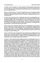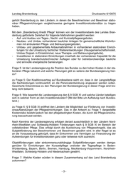 Landtag Brandenburg Drucksache 6/10875 gehört Brandenburg zu den Ländern, in denen die Bewohnerinnen und Bewohner statio- närer Pflegeeinrichtungen vergleichsweise geringere Investitionskostensätze zu tragen haben. Mit dem „Brandenburg Kredit Pflege“ können von der Investitionsbank des Landes Bran- denburg geförderte Darlehen für folgende Maßnahmen gewährt werden: - Auf- und Ausbau von Tages-, Nacht- und Kurzzeitpflegeangeboten, - Neubau- und Umbau vorhandener baulicher Anlagen für gemeinschaftliche Wohnfor- men mit ambulanten Pflege- und Betreuungsangeboten, - Umbau- und gegebenenfalls Anbaumaßnahmen in vorhandenen stationären Einrich- tungen für die Umsetzung fachlicher Weiterentwicklungen (Hausgemeinschaftsmodell, Umbau Doppel- in Einzelzimmer, neue Therapie- und Betreuungsangebote), - Investitionen in stationären Einrichtungen innerhalb der vorhandenen Kapazität für die Umsetzung brandschutztechnischer Auflagen oder für betriebsnotwendige bauliche und sinnvolle energetische Sanierungen. Frage 5: Ist der Landesregierung die Position des Bundes zu den hohen Kosten in der sta- tionären Pflege bekannt und welche Planungen gibt es seitens der Bundesregierung hier- zu? zu Frage 5: Der Koalitionsvertrag auf Bundesebene sieht vor, dass in der Langzeitpflege die Sachleistungen kontinuierlich an die Personalentwicklung angepasst werden sollen. Gesicherte Erkenntnisse zu den Planungen der Bundesregierung in dieser Frage sind bis- lang nicht bekannt. Frage 6: Wie bewertet die Landesregierung den § 9 SGB XI und welche Länder beteiligen sich in welcher Form an den Investitionskosten? (Mit der Bitte um Auflistung nach Bundes- land.) zu Frage 6: § 9 SGB XI eröffnet den Ländern die Möglichkeit zur Förderung von Investiti- onsaufwendungen der Pflegeeinrichtungen. Das in der Antwort zu Frage 1 dargestellte Kostenrisiko besteht jedoch bei den pflegebedingten Kosten, die durch die Pflegeversiche- rung bezuschusst werden. Nach Kenntnis der Landesregierung erfolgen derzeit ausschließlich in den Ländern Nord- rhein-Westfalen und Schleswig-Holstein Förderungen nach § 9 SGB XI im Bereich der vollstationären Pflege. Dies erfolgt durch die Ausreichung von Pflegewohngeld, das als Subjektförderung den Bewohnerinnen und Bewohnern gewährt wird. In aller Regel ist es an die Voraussetzung geknüpft, dass ihr Einkommen und Vermögen zur Finanzierung der Aufwendungen für Investitionskosten ganz oder teilweise nicht ausreicht. Objektförderungen oder einkommensunabhängige Subjektförderungen werden demge- genüber für Einrichtungen der Kurzzeitpflege und/oder der Tagespflege in Baden- Württemberg, Bayern, Berlin, Bremen, Hamburg, Mecklenburg-Vorpommern, Nordrhein- Westfalen, Schleswig-Holstein und Niedersachsen gewährt. Frage 7: Welche Kosten würden in diesem Zusammenhang auf das Land Brandenburg zukommen? -3-