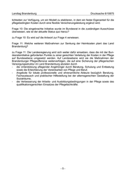 Landtag Brandenburg Drucksache 6/10875 lichkeiten zur Verfügung, um ein Modell zu etablieren, in dem ein fester Eigenanteil für die pflegebedingten Kosten durch eine flexible Versicherungsleistung ergänzt wird. Frage 10: Die eingebrachte Initiative wurde im Bundesrat in die zuständigen Ausschüsse überwiesen, wie ist der aktuelle Status quo hierzu? zu Frage 10: Es wird auf die Antwort zur Frage 4 verwiesen. Frage 11: Welche weiteren Maßnahmen zur Senkung der Heimkosten plant das Land Brandenburg? zu Frage 11: Die Landesregierung wird sich weiter dafür einsetzen, dass die mit der Bun- desratsinitiative geforderten Punkte zu einer gerechten Verteilung der Kosten in der Pflege auf Bundesebene umgesetzt werden. Auf Landesebene wird sie die Maßnahmen der Brandenburger Pflegeoffensive weiterverfolgen, die auf eine Sicherung der pflegerischen Versorgungsstruktur im Land Brandenburg abzielen durch - die Unterstützung pflegender Angehöriger durch Beratung, Schulung und Entlastung sowie die Erleichterung der Vereinbarkeit von Pflege und Beruf, - Angebote für lokale professionelle und ehrenamtliche Akteure bezüglich Beratung, Fachaustausch und praktischer Hilfestellung bei der alternsgerechten Gestaltung der Sozialräume, - die Verbesserung der Arbeits- und Ausbildungsbedingungen in der Pflege sowie des qualifikationsgerechten Einsatzes der Pflegefachkräfte. -5-