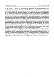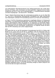Landtag Brandenburg Drucksache 6/10518 2015 Im Jahr 2015 mobilisierte die RH vor allem gegen Rechtsextremisten. Im Februar 2015 wurden auf den Homepages der Ortsgruppen Königs Wusterhausen und Cottbus anläss- lich regionaler rechtsextremistischer Demonstrationen Aufrufe zu Gegendemonstrationen eingestellt. In der späteren Darstellung auf der Homepage der RH zu der Cottbuser De- monstration wird insbesondere das angebliche Fehlverhalten der eingesetzten Polizeikräf- te thematisiert und an Einzelbeispielen vermeintlich überhartes Vorgehen gegen Gegen- demonstranten dargelegt. Dies alles geschieht unter dem Aspekt, die Rechtmäßigkeit staatlichen Handelns in Frage zu stellen und es zu diskreditieren. 2016 Im Jahr 2016 unterstützte die RH unter anderem Demonstrationen und Aktionen gegen Versammlungen des POGIDA-Bündnissees in Potsdam. Die RH versorgte verschiedene Gruppen und Akteure mit Know-how und veranstaltete Vorträge und Schulungen zum Um- gang mit Polizeibeamten und Sicherheitsbehörden. Damit hatte sie maßgeblich zur Pro- fessionalisierung der gewaltbereiten autonomen Szene beigetragen und die Gewalteskala- tion im Frühjahr 2016 befördert. 2017 Die RH hatte auch im Jahr 2017 in der gesamten linksextremistischen Szene Einfluss. Sie diente ihr als Scharnier und unterstützt die Szene mit Know-how, organisiert Veranstaltun- gen, Schulungen und Trainings. Bei den Aktions- und Blockadetrainings werden Strategien und Taktiken regelmäßig den aktuellen Gegebenheiten angepasst. Darüber hinaus betrieb die RH auch 2017 ihr Kerngeschäft mit der Verteidigung und Beratung linksextremistischer Straftäter und veröffentlichte zahlreiche Demonstrationen und Versammlungen zum Um- gang mit Polizeibeamten und Sicherheitsbehörden. 2018 Die Aktivitäten der RH im Jahr 2018 werden im Verfassungsschutzbericht abgebildet. Ins- gesamt ist festzustellen, dass der sich seit Jahren festzustellende Trend zu einem klan- destinen Vorgehen der RH sich im Jahr 2018 fortsetzt. Termine für Treffen der RH werden nur noch selten öffentlich bekannt gegeben und können daher in der öffentlichen Bericht- erstattung nicht erwähnt werden. Weiterhin rief die RH alljährlich zu Versammlungen anlässlich des 18. März “Internationaler Tag der Hilfe für die politischen Gefangenen” auf. Laut eigenen Angaben der OG Potsdam, welche auf deren Homepage veröffentlicht sind, finden regel- mäßige Beratungen am 1. Mittwoch im Monat um 19 Uhr im Kontext Hermann-Elflein-Str. 32 in Potsdam statt. Frage 3: Ist der Landesregierung bekannt, ob seit 2014 Werbematerialien der „Roten Hilfe e.V.“ in staatlich genutzten Gebäuden erhältlich waren? (Bitte auflisten nach Kalenderjahr, Gebäudestandort, Gebäudenutzer und Art des jeweiligen Werbematerials.) zu Frage 3: Hierzu liegen der Landesregierung keine Erkenntnisse vor. Frage 4: Wie bewertet die Landesregierung, dass Anfang 2015 der „Spartacus e.V.“ den von der Stadt Potsdam verliehenen Ehrenamtspreis der örtlichen „Roten Hilfe e.V.“ widme- te? -3-