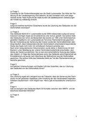 Landtag Brandenburg Drucksache 6/602 6. Wahlperiode Antwort der Landesregierung auf die Kleine Anfrage 182 des Abgeordneten Sven Petke der CDU-Fraktion Drucksache 6/424 Streichung des Gebäudes Markt 33 in Luckenwalde von der Denkmalliste Wortlaut der Kleinen Anfrage 182 vom 14.01.2015 Vorbemerkung: Laut Pressemeldung der MAZ vom 05. Januar 2015 wurde in Luckenwalde das nach allen denkmalpflegerischen Gesichtspunkten sanierte Gebäude Markt 33 nach Fer- tigstellung von der Denkmalliste des Landes Brandenburg gestrichen, da die histori- sche Substanz nicht mehr ausreiche. Laut Zitat des privaten Bauherrn im selben Ar- tikel haben sich die Denkmalpfleger das nach ihren Vorgaben und Auflagen sanierte Gebäude nach der Fertigstellung und vor der Streichung von der Denkmalliste nicht einmal angesehen, bevor sie die Streichung veranlassten. Ich frage die Landesregierung: 1. In welcher Höhe wurde die Sanierung des Gebäudes durch öffentliche Mittel unterstützt? 2. Aufgrund welches fachlichen Gutachtens wurde die Löschung des Gebäudes von der Denkmalliste veranlasst? 3. Auf welchen Untersuchungen und Quellen fußt das Gutachten, das zur Lö- schung des Gebäudes von der Denkmalliste führte? 4. Gab es bezüglich des Gebäudes Markt 33 Kontakte zwischen dem MWFK und der beschlussfassenden Behörde? Namens der Landesregierung beantwortet die Ministerin für Wissenschaft, For- schung und Kultur die Kleine Anfrage wie folgt: Frage 1: In welcher Höhe wurde die Sanierung des Gebäudes durch öffentliche Mittel unter- stützt? Datum des Eingangs: 06.02.2015 / Ausgegeben: 12.02.2015