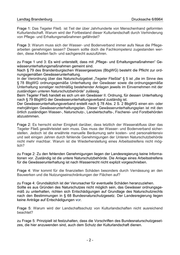 Landtag Brandenburg Drucksache 6/8964 Frage 1: Das Tegeler Fließ ist Teil der über Jahrhunderte von Menschenhand geformten Kulturlandschaft. Warum wird der Fortbestand dieser Kulturlandschaft durch Verhinderung von Pflege- und Erhaltungsmaßnahmen gefährdet? Frage 3: Warum muss sich der Wasser- und Bodenverband immer aufs Neue die Pflege- arbeiten genehmigen lassen? Diesem sollte doch die Fachkompetenz zugestanden wer- den, diese Arbeiten fach- und sachgerecht auszuführen. zu Frage 1 und 3: Es wird unterstellt, dass mit „Pflege- und Erhaltungsmaßnahmen“ Ge- wässerunterhaltungsmaßnahmen gemeint sind. Nach § 79 des Brandenburgischen Wassergesetzes (BbgWG) besteht die Pflicht zur ord- nungsgemäßen Gewässerunterhaltung. In der Verordnung über das Naturschutzgebiet „Tegeler Fließtal“ § 5 ist „die im Sinne des § 78 BbgWG ordnungsgemäße Unterhaltung der Gewässer sowie die ordnungsgemäße Unterhaltung sonstiger rechtmäßig bestehender Anlagen jeweils im Einvernehmen mit der zuständigen unteren Naturschutzbehörde“ zulässig. Beim Tegeler Fließ handelt es sich um ein Gewässer II. Ordnung, für dessen Unterhaltung nach § 79 BbgWG der Gewässerunterhaltungsverband zuständig ist. Der Gewässerunterhaltungsverband erstellt nach § 78 Abs. 2 S. 2 BbgWG einen ein- oder mehrjährigen Gewässerunterhaltungsplan. Dieser Gewässerunterhaltungsplan ist mit den örtlich zuständigen Wasser-, Naturschutz-, Landwirtschafts-, Fischerei- und Forstbehörden abzustimmen. Frage 2: Es herrscht sicher Einigkeit darüber, dass letztlich der Wasserabfluss über das Tegeler Fließ gewährleistet sein muss. Das muss der Wasser- und Bodenverband sicher- stellen. Jedoch ist die erwähnte manuelle Beräumung sehr kosten- und personalintensiv und seit einigen Jahren durch fehlende Genehmigungen der Unteren Naturschutzbehörde nicht mehr machbar. Warum ist die Wiederherstellung eines Arbeitsstreifens nicht mög- lich? zu Frage 2: Zu den fehlenden Genehmigungen liegen der Landesregierung keine Informa- tionen vor. Zuständig ist die untere Naturschutzbehörde. Die Anlage eines Arbeitsstreifens für die Gewässerunterhaltung ist nach Wasserrecht nicht explizit vorgeschrieben. Frage 4: Wer kommt für die finanziellen Schäden besonders durch Vernässung an den Bauwerken und die Nutzungseinschränkungen der Flächen auf? zu Frage 4: Grundsätzlich ist der Verursacher für eventuelle Schäden heranzuziehen. Sollte es aus Gründen des Naturschutzes nicht möglich sein, das Gewässer ordnungsge- mäß zu unterhalten, richten sich Entschädigungen auf Grundlage des Naturschutzrechts nach den Bestimmungen in § 68 Bundesnaturschutzgesetz. Der Landesregierung liegen keine Anträge auf Entschädigungen vor. Frage 5: Warum wird der Landschaftsschutz von Kulturlandschaften nicht ausreichend beachtet? zu Frage 5: Prinzipiell ist festzuhalten, dass die Vorschriften des Bundesnaturschutzgeset- zes, die hier anzuwenden sind, auch dem Schutz der Kulturlandschaft dienen. -2-