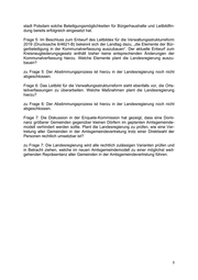 stadt Potsdam solche Beteiligungsmöglichkeiten für Bürgerhaushalte und Leitbildfin- dung bereits erfolgreich eingesetzt hat. Frage 5: Im Beschluss zum Entwurf des Leitbildes für die Verwaltungsstrukturreform 2019 (Drucksache 6/4621-B) bekennt sich der Landtag dazu, „die Elemente der Bür- gerbeteiligung in der Kommunalverfassung auszubauen“. Der aktuelle Entwurf zum Kreisneugliederungsgesetz enthält bisher keine entsprechenden Änderungen der Kommunalverfassung hierzu. Welche Elemente plant die Landesregierung auszu- bauen? zu Frage 5: Der Abstimmungsprozess ist hierzu in der Landesregierung noch nicht abgeschlossen. Frage 6: Das Leitbild für die Verwaltungsstrukturreform sieht ebenfalls vor, die Orts- teilverfassungen zu überarbeiten. Welche Maßnahmen plant die Landesregierung hierzu? zu Frage 6: Der Abstimmungsprozess ist hierzu in der Landesregierung noch nicht abgeschlossen. Frage 7: Die Diskussion in der Enquete-Kommission hat gezeigt, dass eine Domi- nanz größerer Gemeinden gegenüber kleinen Dörfern im geplanten Amtsgemeinde- modell verhindert werden sollte. Plant die Landesregierung zu prüfen, wie eine Ver- tretung aller Gemeinden in der Amtsgemeindevertretung trotz einer Direktwahl der Personen rechtlich umsetzbar ist? zu Frage 7: Die Landesregierung wird alle rechtlich zulässigen Varianten prüfen und in Betracht ziehen, welche im neuen Amtsgemeindemodell zu einer möglichst weit- gehenden Repräsentanz aller Gemeinden in der Amtsgemeindevertretung führen.