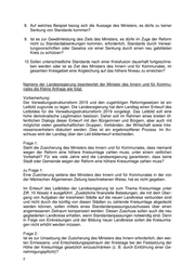 Frage 9: Ist es zur Gewährleistung des Ziels des Ministers, es dürfe im Zuge der Reform nicht zu Standardabsenkungen kommen, erforderlich, Standards durch Verwaltungsvor- schriften oder Gesetze vor einer Senkung durch einen neu gebildeten Kreis zu schützen? Frage 10: Sollen unterschiedliche Standards nach einer Kreisfusion dauerhaft fortgeschrieben werden oder ist es Ziel des Ministers des Innern und für Kommunales, im gesamten Kreisgebiet eine Angleichung auf das höhere Niveau zu erreichen? zu den Fragen 9 und 10: Es wird auf die Vorbemerkung sowie auf die Antwort zu Frage 1 verwiesen.