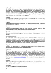 zu Frage 2: Es wird auf die Antwort zu Frage 1 verwiesen. Darüber hinaus kann mitgeteilt wer- den, dass die Landesregierung keine Gesetzesinitiativen zur Einschränkung der Er- messens- und Entscheidungsspielräume der Kreistage bei der Festsetzung des He- besatzes der Kreisumlage gemäß § 130 BbgKVerf erwägt. Auch die Einführung von zusätzlichen kommunalaufsichtlichen Genehmigungen zur Beschränkung der Höhe des Hebesatzes der Kreisumlage ist nicht geplant. Frage 3: In welcher Höhe sind in der Finanzplanung des Landes Mittel für den Ausgleich mög- licher Differenzen zu veranschlagen? Frage 4: Soll der Ausgleich möglicher Differenzen aus Mitteln des kommunalen Finanzaus- gleiches finanziert werden? Frage 5: Soll die Entschädigung einer Stadt, die ihren Status als Kreisstadt verliert, in Geld geleistet werden? Sollen diese Geldzahlungen befristet werden? Frage 6: Soll die Kreissitzentschädigung aus dem kommunalen Finanzausgleich finanziert werden? zu den Fragen 3 bis 6: Es wird auf die Vorbemerkung verwiesen. Im Leitbildentwurf der Landesregierung (Landtagsdrucksache 6/1788) ist keine Kreissitz-Entschädigung vorgesehen. Die Ausgestaltung eines möglichen Standardanpassungsszuschusses wird im Rahmen des breiten öffentlichen Dialoges und im Landtag diskutiert. Der Meinungsbildungs- prozess innerhalb der Landesregierung ist noch nicht abgeschlossen Frage 7: Wo sieht die Landesregierung im Zusammenhang mit der Reform Standardunter- schiede zwischen Kommunen (bitte Beispiele nennen)? zu Frage 7: Die Landesregierung geht davon aus, dass Ermessens- und Beurteilungsspielräume der eigenständigen Landkreise und kreisfreien Städten bereits bisher zu Unterschie- den in der Aufgabenwahrnehmung führten. Als ein Beispiel kann dabei die Erledi- gung der kreislichen Aufgabe der öffentlichen Jugendhilfe genannt werden. Das Er- gebnis der überörtlichen Prüfung der Landkreise als Träger der öffentlichen Jugend- hilfe kann unter www.mik.brandenburg.de (Kommunales Prüfungsamt) abgerufen werden. Frage 8: Auf welches Beispiel bezog sich die Aussage des Ministers, es dürfe zu keiner Sen- kung von Standards kommen? zu Frage 8: Es wird auf die Antwort zu Frage 1 verwiesen.
