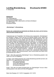Landtag Brandenburg Drucksache 6/5483 6. Wahlperiode Antwort der Landesregierung auf die Kleine Anfrage Nr. 2210 der Abgeordneten Björn Lakenmacher und Danny Eichelbaum der CDU-Fraktion Drucksache 6/5320 „Reichsbürger“ in Brandenburg Namens der Landesregierung beantwortet der Minister des Innern und für Kommu- nales die Kleine Anfrage wie folgt: Vorbemerkungen der Fragesteller: Die Schüsse eines sogenannten „Reichsbürgers“ auf Polizisten in Bayern, durch die einer der Beamten getötet wurde, stellen eine neue Qualität der Gewalt dar. Der brandenburgische Verfassungsschutz hat in die- sem Zusammenhang vor einer Gefahr durch die etwa 300 „Reichsbürger“ gewarnt. Unter diesen steige die Gewaltbereitschaft immer weiter an. Im Frühjahr diesen Jah- res warnte der Leiter des Verfassungsschutzes, Carlo Weber, vor zunehmen aggres- sivem Verhalten der Reichsbürger gegenüber Mitarbeitern von Finanzbehörden, Kommunen und Landkreisen. Bereits zu Beginn dieses Jahres hatten die „Reichs- bürger“ mit ihrer sogenannten „Malta-Masche“ von sich reden gemacht. Dabei mel- den sie fiktive Schadensersatzforderungen in horrender Höhe bei einem Schuldenre- gister in den USA an, die diese Forderung – ungeprüft – an ein Inkassounternehmen auf Malta abgetreten, welches dann in einem, dem vereinfachten Mahnverfahren ähnlichen Verfahren, die Forderung eintreibt. Hierzu wurde bereits eine Kleine Anfra- ge beantwortet (Drs. 6/5071). Frage 1: Wie viele sogenannte „Reichsbürger“ hat es in Brandenburg jeweils in den Jahren 2010 bis 2016 gegeben? zu Frage 1: Der Verfassungsschutz des Landes Brandenburg berichtet seit dem Jah- resbericht 2012 regelmäßig über Reichsbürger: 2012: ohne Personenpotenzial 2013: 100 (teilweise geschätzt) 2014: 150 bis 200 (teilweise geschätzt) 2015: 300 (teilweise geschätzt) Frage 2: Wie viele und welche Gruppierungen aus „Reichsbürgern“ hat es in Bran- denburg jeweils in den Jahren 2010 bis 2016 gegeben? Datum des Eingangs: 22.11.2016 / Ausgegeben: 28.11.2016