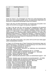 Anzahl der Personen 2010 32 2011 38 2012 49 2013 66 2014 87 2015 96 2016 95 Soweit die Antwort in die Zuständigkeit der Polizei des Landes Brandenburg fällt, können dazu keine Aussagen getroffen werden, da entsprechende Möglichkeiten der Recherche zu sogenannten Reichsbürgern derzeit nicht bestehen. Frage 5: Wie viele und welche Reichsbürger und Gruppierungen sind jeweils in den Jahren 2010 bis 2016 wo und gegen wen gewaltsam aufgetreten? zu Frage 5: Seit dem Jahr 2011 sind im Sinne der Fragestellung 82 sogenannte Reichsbürger (Stand 24.10.2016) im Polizeilichen Auskunftssystem erfasst. Zum vorgenannten Personenkreis konnte folgendes detailliertes Ergebnis recherchiert werden. In 41 Fällen wurden von 17 dieser Personen Straftaten im Sinne der Frage- stellung begangen (23 x Widerstand gegen Vollstreckungsbeamte, 16 x einfache und gefährliche Körperverletzung, 1 x Räuberischer Diebstahl, 1 x Gefährliche Eingriffe in den Straßenverkehr). In 24 Fällen richteten sich die Straftaten gegen Polizeibeamte. Einen regionalen Schwerpunkt bildete die Polizeidirektion (PD) Süd mit 29 Straftaten (PD West: vier, PD Ost: acht). Frage 6: Wie häufig wurde jeweils in den Jahren 2010 bis 2016 durch diese gegen welche Straftatbestände verstoßen? zu Frage 6: Zu 25 Personen des in Frage 5 benannten Personenkreises liegen poli- zeiliche Erkenntnisse zu 293 Straftaten im Land Brandenburg in den Jahren 2010 bis 2016 vor. Die Straftaten schlüsseln sich wie folgt auf: 248 Straftaten gemäß Strafgesetzbuch, davon 19 Verstöße - Friedensverrat, Hochverrat und Gefährdung des demokratischen Rechtsstaates (§§ 80 - 92b StGB) 23 Verstöße - Widerstand gegen die Staatsgewalt (§§ 110 - 122 StGB) 18 Verstöße - Straftaten gegen die öffentliche Ordnung (§§ 123 - 145d StGB) 3 Verstöße - Falsche Verdächtigung (§§ 164 – 165 StGB) 54 Verstöße - Beleidigung (§§ 185 – 200 StGB) 9 Verstöße - Verletzung des persönlichen Lebens und Geheimbereich (§§ 201 – 230 StGB) 19 Verstöße - Straftaten gegen die körperliche Unversehrtheit (§§ 223 – 231 StGB) 39 Verstöße - Straftaten gegen die persönliche Freiheit (§§ 232 - 241a StGB) 26 Verstöße - Diebstahl und Unterschlagung (§§ 242 - 248c StGB) 1 Verstoß - Raub und Erpressung (§§ 249 – 256 StGB) 7 Verstöße - Betrug und Untreue (§§ 263 - 266b StGB) 10 Verstöße - Urkundenfälschung (§§ 267 - 282 StGB) 12 Verstöße - Sachbeschädigung (§§ 303 - 305a StGB) 3 Verstöße - Gemeingefährliche Straftaten (§§ 306 - 323c StGB) 5 Verstöße - Straftaten gegen die Umwelt (§§ 324 - 330d StGB)