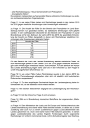 - „Die Reichsbewegung – Neue Gemeinschaft von Philosophen“, - „Europäische Aktion“. Es existieren insbesondere auf personeller Ebene zahlreiche Verbindungen zu ande- ren rechtsextremistischen Organisationen. Frage 11: In wie vielen Fällen haben sich Reichsbürger jeweils in den Jahren 2010 bis 2016 gegen staatliche Anordnungen oder Anweisungen widersetzt? zu Frage 11: Die Anzahl der Fälle für den Bereich der Finanzämter im Land Bran- denburg können nur geschätzt werden, da statistische Erhebungen nicht geführt werden. In der nachfolgenden Übersicht für den Bereich der Finanzämter im Land Brandenburg ist für den Zeitraum der Jahre 2010 bis 2016 die geschätzte Entwick- lung der Anzahl von Fällen dargestellt, in denen sich Reichsbürger staatlichen An- ordnungen oder Anweisungen widersetzt haben. Anzahl der Fälle 2010 75 2011 76 2012 141 2013 218 2014 252 2015 195 2016 216 Für den Bereich der Justiz des Landes Brandenburg werden statistische Daten, ob sich Reichsbürger jeweils in den Jahren 2010 bis 2016 gegen staatliche Anordnun- gen oder Anweisungen widersetzt haben, nicht erhoben. Für den Bereich der Polizei des Landes Brandenburg liegen keine über die in den Antworten zu den Fragen 5 und 6 hinausgehenden Erkenntnisse vor. Frage 12: In wie vielen Fällen haben Reichsbürger jeweils in den Jahren 2010 bis 2016 ihren Personalausweis abgegeben oder sich mit staatlich nicht autorisierten Dokumenten ausgewiesen? zu Frage 12: Zu dem angefragten Sachverhalt liegen der Landesregierung keine In- formationen vor, da sie statistisch nicht erfasst werden. Frage 13: Mit welchen Maßnahmen begegnet die Landesregierung den Reichsbür- gern? zu Frage 13: Auf die Antwort zu Frage 3 wird verwiesen. Frage 14: Gibt es in Brandenburg inzwischen Betroffene der sogenannten „Malta- Masche“? zu Frage 14: Dem Ministerium der Justiz und für Europa und Verbraucherschutz des Landes Brandenburg sind bisher keine Fälle berichtet worden, in denen es zu einer Zustellung oder auch nur zu einem Zustellversuch gegen (Justiz-)Bedienstete des Landes gekommen ist. Auch sind bisher keine Fälle bekannt geworden, in denen gegen Justizbedienstete des Landes fingierte Forderungen durch sogenannte Reichsbürger im Uniform-Commercial-Code, (UCC-)Schuldnerregister des Washing-