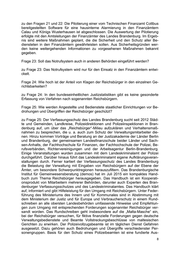 zu den Fragen 21 und 22: Die Pilotierung einer vom Technischen Finanzamt Cottbus bereitgestellten Software für eine hausinterne Alarmierung in den Finanzämtern Calau und Königs Wusterhausen ist abgeschlossen. Die Auswertung der Pilotierung erfolgte mit den Amtsleitungen der Finanzämter des Landes Brandenburg. Im Ergeb- nis sind weitere Maßnahmen geplant, die die Sicherheit und den Schutz aller Be- diensteten in den Finanzämtern gewährleisten sollen. Aus Sicherheitsgründen wer- den keine weitergehenden Informationen zu vorgesehenen Maßnahmen bekannt gegeben. Frage 23: Soll das Notrufsystem auch in anderen Behörden eingeführt werden? zu Frage 23: Das Notrufsystem wird nur für den Einsatz in den Finanzämtern entwi- ckelt. Frage 24: Wie hoch ist der Anteil von Klagen der Reichsbürger in den einzelnen Ge- richtsbarkeiten? zu Frage 24: In den bundeseinheitlichen Justizstatistiken gibt es keine gesonderte Erfassung von Verfahren nach sogenannten Reichsbürgern. Frage 25: Wie werden Angestellte und Bedienstete staatlicher Einrichtungen vor Be- drohungen und Übergriffen der Reichsbürger geschützt? zu Frage 25: Der Verfassungsschutz des Landes Brandenburg sucht seit 2012 Städ- te und Gemeinden, Landkreise, Polizeidirektionen und Polizeiinspektionen in Bran- denburg auf, um über das „Reichsbürger“-Milieu aufzuklären und Verhaltensmaß- nahmen zu besprechen, die u. a. auch zum Schutz der Verwaltungsmitarbeiter die- nen. Hinzu kommen Vorträge und Beratung an der Justizakademie der Länder Berlin und Brandenburg, der gemeinsamen Landesfinanzschule beider Länder und Sach- sen-Anhalts, der Fachhochschule für Finanzen, der Fachhochschule der Polizei, Be- rufsverbänden, Richtervereinigungen und der Arbeitsagentur Berlin-Brandenburg. Einige Veranstaltungen wurden zusammen mit dem Landeskriminalamt der Polizei durchgeführt. Darüber hinaus führt das Landeskriminalamt eigene Aufklärungsveran- staltungen durch. Ferner kartiert der Verfassungsschutz des Landes Brandenburg die Belastung der Verwaltung mit Eingaben von Reichsbürgern auf der Ebene der Ämter, um besondere Schwerpunktregionen herauszufiltern. Das Brandenburgische Institut für Gemeinwesensberatung (demos) hat im Juli 2015 ein kompaktes Hand- buch zum Thema Reichsbürger herausgegeben. Das Handbuch ist ein Kooperati- onsprodukt von Mitarbeitern mehrerer Behörden, darunter auch Experten des Bran- denburger Verfassungsschutzes und des Landeskriminalamtes. Das Handbuch klärt auf, informiert und gibt Hilfeleistung für den Umgang mit Reichsbürgern. Unter Feder- führung des Ministeriums des Innern und für Kommunales sind in Abstimmung mit dem Ministerium der Justiz und für Europa und Verbraucherschutz in einem Rund- schreiben an alle obersten Landesbehörden umfassende Hinweise und Empfehlun- gen zum Umgang mit entsprechenden Forderungen sogenannter Reichsbürger ver- sandt worden. Das Rundschreiben geht insbesondere auf die „Malta-Masche“ ein, bei der Reichsbürger versuchen, für fiktive finanzielle Forderungen gegen deutsche Verwaltungsbedienstete und Beamte Vollstreckungsbeschlüsse von maltesischen Gerichten zu erwirken. Der Polizeivollzugsbeamte ist im täglichen Dienst Gefahren ausgesetzt. Dazu gehören auch Bedrohungen und Übergriffe verschiedenster Per- sonengruppen. Basis für den Schutz eines Polizeibeamten ist eine fundierte Aus-