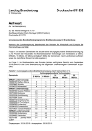 Landtag Brandenburg Drucksache 6/11952 6. Wahlperiode Antwort der Landesregierung auf die Kleine Anfrage Nr. 4749 des Abgeordneten Dierk Homeyer (CDU-Fraktion) Drucksache 6/11772 Umsetzung des Bundesförderprogramms Breitbandausbau in Brandenburg Namens der Landesregierung beantwortet der Minister für Wirtschaft und Energie die Kleine Anfrage wie folgt: Frage 1: In welchen Gemeinden ist aktuell keine leitungsgebundene Breitbandversorgung (< 10 Prozent der Haushalte) mit festnetzbasierter Technologie von mindestens 2 Mbit/s, 6 Mbit/s, 16 Mbit/s, 30 Mbit/s verfügbar? (Bitte die Gemeinden nach Landkreisen auflisten sowie die betroffene Einwohnerzahl angeben.) zu Frage 1: Im Breitbandatlas des Bundes (letzter verfügbarer Bericht vom September 2018) sind für das Land Brandenburg die folgenden unterversorgten Gemeinden aufge- führt: Tabelle 1: Leitungsgebundene Breitbandversorgung nach Gemeinden in % Leitungsgebundene Technologien Gemeinde 16 30 50 2 Mbit/s 6 Mbit/s Mbit/s Mbit/s Mbit/s 2 Mbit/s unterversorgt: 12063161 Kleßen-Görne 1 1 1 1 1 12062440 Schilda 1 1 1 1 1 12064222 Höhenland 4 4 4 4 4 6 Mbit/s unterversorgt: 12064190 Gusow-Platkow 23 2 2 2 2 12071060 Drehnow 93 2 2 2 2 12062208 Großthiemig 72 4 4 2 2 12071384 Tauer 73 4 4 4 4 12063112 Großderschau 67 5 2 2 2 12064009 Alt Tucheband 38 6 3 2 2 12064290 Lindendorf 43 6 5 5 2 12064130 Fichtenhöhe 72 10 2 1 1 12071401 Turnow-Preilack 92 10 3 3 3 16 Mbit/s unterversorgt: 12063094 Gollenberg 68 42 1 1 1 12064482 Vierlinden 52 15 1 1 1 12071189 Jämlitz-Klein 54 14 1 1 1 Düben Eingegangen: 20.08.2019 / Ausgegeben: 26.08.2019