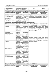 Landtag Brandenburg Drucksache 6/11952 Oberspreewald- Endgültige Bescheide: 2023 4.567 Lausitz Bund/Land 07/2019 Antragstellung/Konkretisierung auf endgültige Bescheide beim Bund ist erfolgt Gebietskörperschaft Aktueller Verfahrens- Planung Projekt- Auszubauende stand realisierung Haushalte Märkisch-Oderland Antragsstellung zum Angaben wegen noch ausstehender 7 Projektgebiete endgültigen Bescheid endgültiger Bewilligungen und Ver- beim Bund: 05/2019 tragsunterzeichnungen nicht möglich Spree-Neiße Antragsstellung zum Projektgebiet Guben endgültigen Bescheid beim Bund: 05/2019 Europaweite Vergabeverfahren noch nicht abgeschlossen Gebietskörperschaft Aktueller Verfahrens- Planung Projek- Auszubauende stand trealisierung Haushalte Cottbus Planung Vergabeab- Angaben wegen noch nicht abge- schluss sowie finale An- schlossener Vergabeverfahren sowie tragsstellung beim Bund: ausstehender endgültiger Bewilligun- Ende 2019 gen nicht möglich Havelland Planung Vergabeab- 4 Projektgebiete schluss: Au- gust/September 2019 Planung Beantragung endgültige Bewilligung: Angaben wegen noch nicht abge- Ende September/ Anfang schlossener Vergabeverfahren sowie Oktober 2019 ausstehender endgültiger Bewilligun- Prignitz Planung Vergabeab- gen nicht möglich schluss: September 2019 Planung Beantragung endgültige Bewilligung: Ende September/ Anfang Oktober 2019 Teltow-Fläming Planung Vergabeab- schluss: November 2019 Planung Beantragung endgültige Bewilligung: Dezember 2019 Uckermark Planung Vergabeab- 2 Projektgebiete schluss: Ende Au- gust/Anfang September 2019 Planung Beantragung endgültige Bewilligung: September 2019 Europaweite Vergabeverfahren noch am Anfang des Verfahrens Gebietskörperschaft Aktueller Verfahrens- Planung Projekt- Auszubauende stand realisierung Haushalte -4-