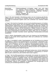 Landtag Brandenburg Drucksache 6/11952 Spree-Neiße Teilnahmewettbewerb ist Angaben wegen noch nicht abge- 5 Projektgebiete neu aufgesetzt; Planung schlossener Vergabeverfahren sowie Vergabeabschluss: Ende ausstehender endgültiger Bewilligun- 2019/Anfang 2020 gen nicht möglich Planung endgültige Be- willigungen: Anfang 2020 Frage 5: Wie viele Haushalte in Brandenburg werden nach der Umsetzung des Bundes- förderprogramms in den Genuss von schnellem Internet mit mindestens 50 Mbit/s kom- men? (Bitte die Gesamtzahl angeben sowie nach Landkreisen bzw. kreisfreien Städten auflisten.) zu Frage 5: Die Anzahl der Haushalte, die durch das Bundesförderprogramm mit breitban- digem Internet versorgt werden, kann erst angegeben werden, wenn die entsprechenden Vergabeverfahren abgeschlossen sind und die endgültigen Bewilligungen vorliegen. Für alle Landkreise, in denen die Vergabeverfahren schon abgeschlossen sind und die endgül- tigen Bewilligungen vorliegen, sind die Informationen in Tabelle 2 (Antwort zu Frage 4) er- gänzt. Informationen dazu, wie viele Haushalte insgesamt in Brandenburg nach der Durch- führung des Förderprogramms erschlossen sein werden, liegen nicht vor. Ist-Angaben zu den insgesamt versorgten Haushalten werden regelmäßig im Breitbandatlas des Bundes veröffentlicht. Frage 6: Welche Gewerbegebiete werden durch die Umsetzung des Bundesförderpro- gramms an das schelle Internet angeschlossen? (Bitte nach Landkreisen bzw. kreisfreien Städten auflisten.) zu Frage 6: Grundsätzlich werden Gewerbegebiete bei der Erschließung der einzelnen Projektgebiete im Rahmen des Bundesprogramms mit erschlossen. Informationen dazu, welche Gewerbegebiete im Einzelnen in diesem Zusammenhang erschlossen werden, liegen nicht vor. Zusätzlich gibt es die Möglichkeit, Gewerbegebiete gesondert auszu- schreiben und zu erschließen, die nicht innerhalb von förderfähigen Gebieten liegen (z. B. weil ein Gebiet insgesamt nicht unterversorgt ist). Bislang hat jedoch kein Antragsteller aus dem Land Brandenburg diese Möglichkeit genutzt. Frage7: Wann ist mit dem Abschluss des geförderten Ausbaus bzw. mit dem tatsächlichen Anschluss der unversorgten Haushalte und Unternehmen in Brandenburg zu rechnen? (Bitte für jeden Landkreis bzw. jede kreisfreie Stadt einzeln angeben.) zu Frage 7: Die Durchführungszeiträume unterscheiden sich zwischen den einzelnen För- dergebieten. Der aktuelle Planungsstand zu den jeweiligen Durchführungszeiträumen der Projektgebiete können nur angegeben werden, wenn die Vergabeverfahren abgeschlos- sen sind und endgültige Bewilligungen vorliegen. Die entsprechenden Informationen sind in Tabelle 2 (Antwort zu Frage 4) enthalten. Die dort angegebenen Werte basieren auf Planungsdaten. Aufgrund von Engpässen im Baugewerbe sind Verzögerungen bei der Umsetzung der Erschließungsmaßnahmen möglich. -5-