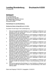 Landtag Brandenburg Drucksache 6/2255 6. Wahlperiode Antwort der Landesregierung auf die Kleine Anfrage 860 des Abgeordneten Christoph Schulze BVB / FREIE WÄHLER Gruppe Drucksache 6/2038 Kita-Schlüssel im Land Brandenburg Wortlaut der Kleinen Anfrage 860 vom 13.7.2015: Aus diesem Grunde frage ich die Landesregierung: 1. Wie war der sogenannte Kita-Schlüssel, d.h. das Verhältnis von Betreuern und betreuten Kindern bei Kindern vom 0. bis zum 3. Lebensjahr in Kitas im Land Brandenburg vor dem Jahr 2000? 2. Wie war der sogenannte Kita-Schlüssel, d.h. das Verhältnis von Betreuern und betreuten Kindern bei Kindern vom 0. bis zum 3. Lebensjahr in Kitas im Land Brandenburg in den Jahren 2000 bis 2005? 3. Wie war der sogenannte Kita-Schlüssel, d.h. das Verhältnis von Betreuern und betreuten Kindern bei Kindern vom 0. bis zum 3. Lebensjahr in Kitas im Land Brandenburg in den Jahren 2005 bis 2010? 4. Wie war der sogenannte Kita-Schlüssel, d.h. das Verhältnis von Betreuern und betreuten Kindern bei Kindern vom 0. bis zum 3. Lebensjahr in Kitas im Land Brandenburg in den Jahren 2010 bis 2014? 5. Wie war der sogenannte Kita-Schlüssel, d.h. das Verhältnis von Betreuern und betreuten Kindern bei Kindern vom 3. bis zum 6. Lebensjahr in Kitas im Land Brandenburg vor dem Jahr 2000? 6. Wie war der sogenannte Kita-Schlüssel, d.h. das Verhältnis von Betreuern und betreuten Kindern bei Kindern vom 3. bis zum 6. Lebensjahr in Kitas im Land Brandenburg in den Jahren 2000 bis 2005? 7. Wie war der sogenannte Kita-Schlüssel, d.h. das Verhältnis von Betreuern und betreuten Kindern bei Kindern vom 3. bis zum 6. Lebensjahr in Kitas im Land Brandenburg in den Jahren 2005 bis 2010? 8. Wie war der sogenannte Kita-Schlüssel, d.h. das Verhältnis von Betreuern und betreuten Kindern bei Kindern vom 3. bis zum 6. Lebensjahr in Kitas im Land Brandenburg in den Jahren 2010 bis 2014? 9. Wie war der sogenannte Kita-Schlüssel, d.h. das Verhältnis von Betreuern und betreuten Kindern bei Hortkindern in Kitas im Land Brandenburg vor dem Jahr 2000? 10. Wie war der sogenannte Kita-Schlüssel, d.h. das Verhältnis von Betreuern und betreuten Kindern bei Hortkindern in Kitas im Land Brandenburg in den Jahren 2000 bis 2005?