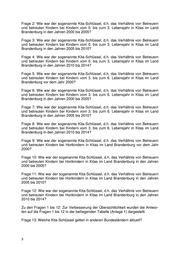 Frage 2: Wie war der sogenannte Kita-Schlüssel, d.h. das Verhältnis von Betreuern und betreuten Kindern bei Kindern vom 0. bis zum 3. Lebensjahr in Kitas im Land Brandenburg in den Jahren 2000 bis 2005? Frage 3: Wie war der sogenannte Kita-Schlüssel, d.h. das Verhältnis von Betreuern und betreuten Kindern bei Kindern vom 0. bis zum 3. Lebensjahr in Kitas im Land Brandenburg in den Jahren 2005 bis 2010? Frage 4: Wie war der sogenannte Kita-Schlüssel, d.h. das Verhältnis von Betreuern und betreuten Kindern bei Kindern vom 0. bis zum 3. Lebensjahr in Kitas im Land Brandenburg in den Jahren 2010 bis 2014? Frage 5: Wie war der sogenannte Kita-Schlüssel, d.h. das Verhältnis von Betreuern und betreuten Kindern bei Kindern vom 3. bis zum 6. Lebensjahr in Kitas im Land Brandenburg vor dem Jahr 2000? Frage 6: Wie war der sogenannte Kita-Schlüssel, d.h. das Verhältnis von Betreuern und betreuten Kindern bei Kindern vom 3. bis zum 6. Lebensjahr in Kitas im Land Brandenburg in den Jahren 2000 bis 2005? Frage 7: Wie war der sogenannte Kita-Schlüssel, d.h. das Verhältnis von Betreuern und betreuten Kindern bei Kindern vom 3. bis zum 6. Lebensjahr in Kitas im Land Brandenburg in den Jahren 2005 bis 2010? Frage 8: Wie war der sogenannte Kita-Schlüssel, d.h. das Verhältnis von Betreuern und betreuten Kindern bei Kindern vom 3. bis zum 6. Lebensjahr in Kitas im Land Brandenburg in den Jahren 2010 bis 2014? Frage 9: Wie war der sogenannte Kita-Schlüssel, d.h. das Verhältnis von Betreuern und betreuten Kindern bei Hortkindern in Kitas im Land Brandenburg vor dem Jahr 2000? Frage 10: Wie war der sogenannte Kita-Schlüssel, d.h. das Verhältnis von Betreuern und betreuten Kindern bei Hortkindern in Kitas im Land Brandenburg in den Jahren 2000 bis 2005? Frage 11: Wie war der sogenannte Kita-Schlüssel, d.h. das Verhältnis von Betreuern und betreuten Kindern bei Hortkindern in Kitas im Land Brandenburg in den Jahren 2005 bis 2010? Frage 12: Wie war der sogenannte Kita-Schlüssel, d.h. das Verhältnis von Betreuern und betreuten Kindern bei Hortkindern in Kitas im Land Brandenburg in den Jahren 2010 bis 2014? Zu den Fragen 1 bis 12: Zur Verbesserung der Übersichtlichkeit wurden die Antwor- ten auf die Fragen 1 bis 12 in der beiliegenden Tabelle (Anlage 1) dargestellt. Frage 13: Welche Kita-Schlüssel gelten in anderen Bundesländern aktuell?
