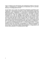 Frage 14: Welches ist der Kita-Schlüssel, den die Bertelsmann-Stiftung in ihrem Gut- achten zur Kinderbetreuung in Deutschland und insbesondere auch im Land Bran- denburg zur Grundlage genommen hat? Zu den Fragen 13 bis 14: Wie in der Vorbemerkung dargestellt, ist das Maß für einen Vergleich der unterschiedlichen Situationen und der unterschiedlichen Regelungs- systematiken in den Bundesländern der „Personalressourceneinsatzschlüssel“. Die Bertelsmann-Stiftung veröffentlicht im „Ländermonitor“ in regelmäßigen Abständen solche Vergleiche, die auf den Angaben der Einrichtungen zur Kinder- und Jugend- hilfestatistik zum 1. März des jeweiligen Jahres beruhen. Die Vergleiche für den 01.03.2013 für Kinder bis zum vollendeten dritten Lebensjahr und für Kinder ab dem vollendeten dritten Lebensjahr befinden sich als Anlage 2 zu dieser Antwort. Für Kin- der im Grundschulalter gibt es solche Vergleiche nicht. Ein Vergleich des statisti- schen Maßes „Personalressourceneinsatzschlüssel“ (siehe Vorbemerkung) mit der gesetzlich bestimmten Personalausstattung zeigt, dass ersterer im Krippenbereich mit 1 : 6,5 leicht schlechter ist als die gesetzlich bestimmte Personalausstattung (1 : 6), während er im Kindergartenbereich mit 1 : 11,5 leicht besser ist (als 1 : 12 in der gesetzlich bestimmten Ausstattung). Vernachlässigt man mögliche Erhebungsfehler und Verzerrungen, die sich auf die punktuelle Messung am 01.03.2014 beziehen, so könnte dies an durchschnittlich längeren Betreuungszeiten im Krippenbereich und kürzeren Betreuungszeiten im Kindergartenbereich liegen.