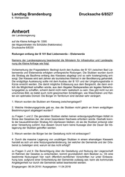 Landtag Brandenburg Drucksache 6/8527 6. Wahlperiode Antwort der Landesregierung auf die Kleine Anfrage Nr. 3395 der Abgeordneten Iris Schülzke (fraktionslos) Drucksache 6/8330 Rodungen entlang der B 101 Bad Liebenwerda – Elsterwerda Namens der Landesregierung beantwortet die Ministerin für Infrastruktur und Landespla- nung die Kleine Anfrage wie folgt: Vorbemerkung der Fragestellerin: Bedingt durch den Ausbau der B 101 zwischen Bad Lie- benwerda und Elsterwerda erfolgten umfangreiche Rodungen. Die Stubben wurden durch die Strabag als Baufirma entlang des Kiessees abgelegt und so sehr kostengünstig ent- sorgt. Der Kiessee wird seit Jahren als touristisches Kleinod in der Bevölkerung gehandelt. Die endgültige Auskiesung sollte mit dem Ausbau der B 101 und der Umgehungsstraße in Kürze erreicht werden. Die damit mögliche Entlassung aus dem Bergrecht, die dann end- lich die Möglichkeit schaffen würde, aus dem illegalen Badeparadies ein legales Naherho- lungsgebiet zu schaffen, scheint damit nicht mehr realistisch zu sein. Das gibt nicht nur ein unschönes Bild, es bietet auch nicht gewünschten Schädlingen, wie Waschbären und Rat- ten ein optimales Domizil. Die Bürger im Territorium sind darüber sehr verärgert. 1. Warum wurden die Stubben am Kiesweg zwischengelagert? 2. Welche Hinderungsgründe gab es, das die Stubben nicht gleich an ihrem endgültigen Bestimmungsort abgelagert wurden? zu Fragen 1 und 2: Die gerodeten Stubben stellen keinen entsorgungspflichtigen Abfall im Sinne des Gesetzes dar, der einen besonderen Nachweis erfordern würde. Deshalb konn- te der bauausführenden Strabag AG überlassen bleiben, ob sie die Stubben entsorgt oder einer Verwertung zuführt. Aus diesem Grund kann keine Aussage über die Dauer der Ab- lagerung der Stubben getroffen werden. 3. Warum werden die Bürger bei der Gestaltung nicht mit einbezogen? 4. Durch die massive Lagerung von unzähligen Stubben in einem ehemaligen Kieswerk handelt es sich um eine Nutzungsartenänderung, bei welcher die Gemeinde und der Orts- beirat zu beteiligen sind, warum ist das nicht erfolgt? zu Fragen 3 und 4: Die Berechtigung über die Gestaltung und Nutzung der Liegenschaft im Rahmen der Gesetze zu entscheiden, kommt grundsätzlich dem Besitzer zu. Ob eine bestimmte Nutzungsart hier nach öffentlich-rechtlichen Vorschriften nur unter Einbezie- hung bzw. aufgrund einer Entscheidung der Gemeinde zulässig war, kann als kommunale Angelegenheit nur durch die Gemeinde selbst beantwortet werden. Eingegangen: 06.04.2018 / Ausgegeben: 11.04.2018