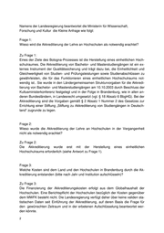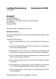 Landtag Brandenburg Drucksache 6/2056 6. Wahlperiode Antwort der Landesregierung auf die Kleine Anfrage 640 der Abgeordneten Dr. Alexander Gauland und Andreas Kalbitz der AfD-Fraktion Drucksache 6/1453 Wortlaut der Kleinen Anfrage 640 vom 15.05.2015 Akkreditierungswesen Im Rahmen der Bologna-Reform ist in Deutschland das Akkreditierungswesen einge- führt worden. Ich frage die Landesregierung: 1.) Wieso wird die Akkreditierung der Lehre an Hochschulen als notwendig erach- tet? 2.) Wieso wurde die Akkreditierung der Lehre an Hochschulen in der Vergangen- heit nicht als notwendig erachtet? 3.) Welche Kosten sind dem Land und den Hochschulen in Brandenburg durch die Akkreditierung entstanden (bitte nach Jahr und Institution aufschlüsseln)? 4.) Wie ist der bürokratische Aufwand der Akkreditierung zu bewerten? Wie viele Stellen wurden deswegen geschaffen? 5.) Wie wird das Akkreditierungswesen von Seiten der Hochschulen und Studen- ten bewertet? 6.) Die Akkreditierung von Studiengängen wurde in Deutschland um 2003 einge- führt. Hat sich die Qualität des Studiums dadurch messbar verbessert? 7.) Wurden wissenschaftliche Untersuchungen zur Qualitätsentwicklung des Stu- diums durchgeführt?