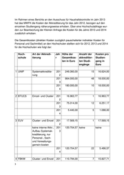 Im Rahmen eines Berichts an den Ausschuss für Haushaltskontrolle im Jahr 2013 hat das MWFK die Kosten der Akkreditierung für das Jahr 2012, bezogen auf den einzelnen Studiengang näherungsweise erhoben. Über eine Hochschulabfrage wur- den zur Beantwortung der Kleinen Anfrage die Kosten für die Jahre 2013 und 2014 zusätzlich erhoben. Die Gesamtkosten (direkten Kosten zuzüglich pauschalierter indirekter Kosten für Personal und Sachmittel) an den Hochschulen stellten sich für 2012, 2013 und 2014 für die Hochschulen wie folgt dar: Hoch- Art der Akkredi- Jah Höhe der Anzahl der Kosten pro schule tierung r Gesamtkos- akkreditier- Studien- ten in Euro ten Studi- gang in engänge Euro 1 UNIP Systemakkreditie- 201 249.360,00 15 16.624,00 rung 2 201 864.000,00 48 18.000,00 3 201 180.000,00 10 18.000,00 4 2 BTUCS Einzel- und Cluster 201 16.963,77 1 16.963,77 2 201 75.014,00 12 6.251,17 3 201 5.440,00 5 1.088,00 4 3 EUV Cluster- und Einzel 201 17.569,15 1 17.569,15 2 keine interne Akkr., 201 120.704,57 keine keine Aufbau Systemak- 3 kreditierung, nur Personal-, Sach- und Verwaltungs- gemein-kosten 201 120.704,57 22 5.486,57 4 4 FBKW Cluster- und Einzel 201 110.794,00 7 15.827,71