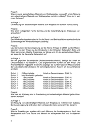 Frage 1: Warum wurde asbesthaltiges Material zum Waldwegebau verwandt? Ist die Nutzung von asbesthaltigem Material zum Waldwegebau rechtlich zulässig? Wenn ja, in wel- chem Rahmen? zu Frage 1: Die Nutzung von asbesthaltigem Material zum Wegebau ist rechtlich nicht zulässig. Frage 2: Wer ist im vorliegenden Fall für den Bau und die Instandhaltung des Waldweges ver- antwortlich? zu Frage 2: Der Windkraftanlagenbetreiber ist für die Stand- und Betriebsflächen sowie sämtliche Zufahrtswege der Windkraftanlagen zuständig. Frage 3: Laut der Antwort der Landregierung auf die Kleine Anfrage D-5/6565 wurden Materi- alproben von den Wegen zu den Windparks in den Ortsteilen Biebersdorf, Botta und Glietz genommen. Welche Ergebnisse zur Menge und Art des asbesthaltigen Materi- als liegen für die Baustraße Biebersdorf vor? zu Frage 3: Bei der geprüften Baustoffprobe (Asbestzementbruchstück) beträgt der Anteil an Chrysotilasbest ≥ 10 Massen-%. Laut Ergebnisbericht wurden auf den Wege- und Kranstellflächen insgesamt 8 Schürfe angelegt. Es wurden folgende Massenanteile der Asbestzementbruchstücke mit zementgebundenen Fasern am Gesamtmaterial ermittelt: Schurf 1 25 Bruchstücke Anteil an Gesamtmasse = 0,062 % Schurf 2 kein Bruchstück gefunden Schurf 3 1 Bruchstück Anteil an Gesamtmasse = 0,003 % Schurf 4 4 Bruchstücke Anteil an Gesamtmasse = 0,011 % Schurf 5 2 Bruchstücke Anteil an Gesamtmasse = 0,005 % Schurf 6 3 Bruchstücke Anteil an Gesamtmasse = 0,009 % Schurf 7 5 Bruchstücke Anteil an Gesamtmasse = 0,008 % Schurf 8 6 Bruchstücke Anteil an Gesamtmasse = 0,014 % Frage 4: Wie viele km Waldweg sind in Brandenburg mit asbesthaltigem Material gebaut bzw. saniert worden? zu Frage 4: Die Nutzung von asbesthaltigem Material zum Wegebau ist rechtlich nicht zulässig. Der Landesregierung sind neben dem vorliegenden keine weiteren Fälle bekannt. Frage 5: Welche Auswirkungen ergeben sich nach Meinung der Landesregierung durch den Asbestgehalt auf Flora, Fauna und Mensch im vorliegenden Fall und im Allgemei- nen?