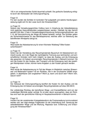100 m ein entsprechendes Schild dauerhaft aufstellt. Die grafische Gestaltung erfolg- te durch den Adressaten der Ordnungsverfügung. Frage 12: Für wen wurden die Schilder im konkreten Fall aufgestellt und welche Handlungsan- weisung ergibt sich für den Leser durch die Hinweisschilder? zu Frage 12: Seitens des Verwaltungsgerichtes Cottbus kann in Ansehung der Asbestbelastung nicht jegliches Gesundheitsrisiko ausgeschlossen werden. Deshalb hat das Gericht gemäß § 80 Abs. 5 Satz 4 Verwaltungsgerichtsordnung Sicherungsmaßnahmen, wie z. B. die Kennzeichnung der Wege als Asbest belastet, verfügt. Die Schilder gelten als Sicherheitshinweise für das Betriebspersonal, welches allein zur Betretung des betreffenden Windparks befugt ist. Frage 13: Was kostet die Asbestsanierung für einen Kilometer Waldweg? Bitte Kosten aufschlüsseln? zu Frage 13: Sofern bei der Herstellung des Recyclingmaterials Bauschutt mit Asbestzement ver- mischt wurde, ist in der Regel die nachträgliche Trennung aus technischen und wirt- schaftlichen Gründen nicht mehr möglich, so dass der Ausbau und die Entsorgung des gesamten mit Asbest verunreinigten Recyclingmaterials in Betracht kommen. Da sich die Kosten für den Ausbau, den Transport und die Entsorgung nach den jeweili- gen Marktpreisen richten, können keine Angaben zu den Kosten gemacht werden. Frage 14: Was würde die Asbestsanierung im Fall des Weges im Waldstück zwischen Briesen- see und Biebersdorf kosten? Ist ein Rückbau, wie in der Drucksache 5/6565 ange- geben, in absehbarer Zeit vorgesehen? Wenn ja, wann und durch wen? Wenn nein, warum nicht? zu Frage 14: Der Adressat der Ordnungsverfügung beziffert die Kosten für den Ausbau und die Entsorgung des mit Asbest verunreinigten Recyclingmaterials auf etwa 390.000 €. Der vollständige Rückbau der betroffenen Wege- und Kranstellflächen wird von der zuständigen Behörde weiter verfolgt. Es ist aber davon auszugehen, dass ein Rück- bau erst nach der gerichtlichen Klärung im Hauptsacheverfahren in Betracht kommt. Frage 15: Insofern bei der anstehenden Kreisgebietsreform die Forstverwaltung kommunalisiert werden soll, wer trägt etwaige Folgekosten für die Unterhaltung bzw. Sanierung der asbestbelasteten Wege und die Wartung, Reparatur bzw. Entfernung und Entsor- gung der Hinweisschilder?