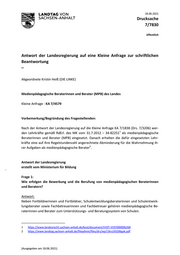 2 Deren Ausschreibung erfolgt durch das Ministerium für Bildung zum Zwecke der weiteren Entwicklung der Qualität von Schule und Unterricht, insbesondere zur nachhaltigen Unter‐ stützung der schulischen Medienbildung und zum Lernen mit digitalen Medien und Werk‐ zeugen. Parallel werden alle allgemeinbildenden und berufsbildenden Schulen des Landes über die Bekanntmachung des Ministeriums für Bildung im Schulverwaltungsblatt per E‐Mail informiert. Das Landesinstitut für Schulqualität und Lehrerbildung Sachsen‐Anhalt führt unter Einbin‐ dung des Landesschulamtes das Auswahlverfahren durch und unterbreitet dem Ministerium für Bildung die Vorschläge zur Berufung der medienpädagogischen Beraterinnen und Bera‐ ter. Die Berufung erfolgt wegen der besonderen pädagogischen Bedeutung von Medienbildung und Medienkompetenz durch das Ministerium für Bildung. Der Berufungszeitraum beträgt drei Schuljahre. Eine angemessene regionale Verteilung auf die Landkreise und kreisfreien Städte ist anzustreben. Frage 2: Auf welcher arbeits‐ oder dienstrechtlichen Grundlage werden die medienpädagogischen Beraterinnen und Berater eingesetzt? Antwort: Als medienpädagogische Beraterinnen bzw. medienpädagogischer Berater werden unbefris‐ tet tätige Lehrkräfte an einer allgemeinbildenden oder berufsbildenden Schule des Landes Sachsen‐Anhalt eingesetzt. Deren Berufung erfolgt im Rahmen des bestehenden Arbeits‐ bzw. Dienstverhältnisses zum Land Sachsen‐Anhalt. Für die Wahrnehmung ihrer Tätigkeiten erhalten die dafür eingesetzten Lehrkräfte eine auf ihre Regelstundenzahl angerechnete Abminderung. Frage 3: Über welche Qualifikationen sollen die eingesetzten Kräfte verfügen? Antwort: Bewerbungsvoraussetzungen der Bewerberinnen und Bewerber sind: a) unbefristet tätige Lehrkraft an einer allgemeinbildenden oder berufsbildenden Schule des Landes Sachsen‐Anhalt, b) Erste und Zweite Staatsprüfung für ein Lehramt oder Lehrbefähigung nach dem Recht der Deutschen Demokratischen Republik, die einem Lehramt zugeordnet werden kann.