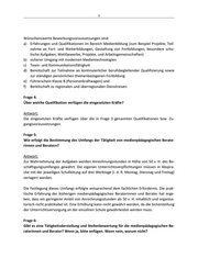 3 Wünschenswerte Bewerbungsvoraussetzungen sind: a) Erfahrungen und Qualifikationen im Bereich Medienbildung (zum Beispiel Projekte, Teil‐ nahme an Fort‐ und Weiterbildungen, Gestaltung von Fortbildungen, besondere schu‐ lische Aufgaben, Wettbewerbe, Projekte, und Arbeitsgemeinschaften) b) sicherer Umgang mit modernen Medientechnologien c) Team‐ und Kommunikationsfähigkeit d) Bereitschaft zur Teilnahme an kontinuierlicher berufsbegleitender Qualifizierung sowie zur ständigen persönlichen themenbezogenen Fortbildung e) Führerschein Klasse B (Personenkraftwagen) und f) Bereitschaft zu regionalen und überregionalen Dienstreisen. Frage 4: Über welche Qualifikation verfügen die eingesetzten Kräfte? Antwort: Die eingesetzten Kräfte verfügen über die in Frage 3 genannten Qualifikationen bzw. Zu‐ gangsvoraussetzungen. Frage 5: Wie erfolgt die Bestimmung des Umfangs der Tätigkeit von medienpädagogischen Berate‐ rinnen und Beratern? Antwort: Zur Wahrnehmung der Aufgaben werden Anrechnungsstunden in Höhe von 50 v. H. des Be‐ schäftigungsumfanges gewährt. Die eigenen Unterrichtsverpflichtungen müssen in Abspra‐ che mit der jeweiligen Schulleitung auf drei Werktage (i. d. R. Montag, Dienstag und Freitag) verlagert werden. Die Festlegung dieses Umfangs erfolgte entsprechend dem fachlichen Erfordernis. Die prak‐ tische Erfahrung der bisherigen medienpädagogischen Beraterinnen und Berater hat erge‐ ben, dass ein geringerer Anteil von Anrechnungsstunden als 50 v. H. inhaltlich und organisa‐ torisch nicht praktikabel ist. Eine Erhöhung kann nicht gewährt werden, da die Sicherstellung der Unterrichtsversorgung an der einzelnen Schule gewährleistet werden muss. Frage 6: Gibt es eine Tätigkeitsdarstellung und Stellenbewertung für die medienpädagogischen Be‐ raterinnen und Berater? Wenn ja, bitte anfügen. Wenn nein, warum nicht?