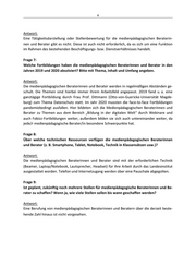 4 Antwort: Eine Tätigkeitsdarstellung oder Stellenbewertung für die medienpädagogischen Beraterin‐ nen und Berater gibt es nicht. Diese ist auch nicht erforderlich, da es sich um eine Funktion im Rahmen des bestehenden Beschäftigungs‐ bzw. Dienstverhältnisses handelt. Frage 7: Welche Fortbildungen haben die medienpädagogischen Beraterinnen und Berater in den Jahren 2019 und 2020 absolviert? Bitte mit Thema, Inhalt und Umfang angeben. Antwort: Die medienpädagogischen Beraterinnen und Berater werden in regelmäßigen Abständen ge‐ schult. Die Themen sind hierbei immer ihrem Arbeitsfeld angepasst. 2019 fand u. a. eine ganztägige Fortbildung durch Frau Prof. Dittmann (Otto‐von‐Guericke‐Universität Magde‐ burg) zum Thema Datenschutz statt. Im Jahr 2020 mussten die face‐to‐face Fortbildungen pandemiebedingt ausfallen. Hier bildeten sich die Medienpädagogischen Beraterinnen und Berater zu Themen aus dem Bereich „Bildung in der digitalen Welt“ durch Webinare und auch Fobizz‐Fortbildungen weiter, außerdem bilden sie sich auch untereinander weiter, da jede/r medienpädagogische Berater/in besondere Schwerpunkte hat. Frage 8: Über welche technischen Ressourcen verfügen die medienpädagogischen Beraterinnen und Berater (z. B. Smartphone, Tablet, Notebook, Technik in Klassensätzen usw.)? Antwort: Die medienpädagogischen Beraterinnen und Berater sind mit der erforderlichen Technik (Beamer, Laptop/Notebook, Lautsprecher, Headset) für ihre Arbeit durch das Landesinstitut ausgestattet worden. Telefon und Internetzugang werden über eine Pauschale abgegolten. Frage 9: Ist geplant, zukünftig noch mehrere Stellen für medienpädagogische Beraterinnen und Be‐ rater zu schaffen? Wenn ja, wie viele Stellen sollen bis wann geschaffen werden? Antwort: Eine Berufung von medienpädagogischen Beraterinnen und Beratern über die derzeit beste‐ hende Zahl hinaus ist nicht vorgesehen.