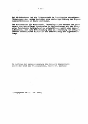 - 2 - Bei AB-Maßnahmen ist die Trigerschaft im Territoriu• abzustimmen. Förderungen des Landes bedingen eine vorherige Klirung dar Eigen tumsverhältnisse an Grund und B o den. Das Ministerium für Wirtschaft, Technologie und Verkehr ist gern bereit dia betroffenen Landkreise in Verhandlungen ait der Deut � schen Reichsbahn dahingehend zu unterstützen, macht aber darauf aufmerksam, daß eine Entscheidung über die Abtretung von entspre chenden Bodenfliehen allein in dar Entscheidung des Eigentümers liegt. Im Auftrag der Landesre g ierung die Antwort übermittelt durch den Chef der Staatskanzlei, Herrn Or. Gerhold (Ausgegeben am 11. 07. 1991)