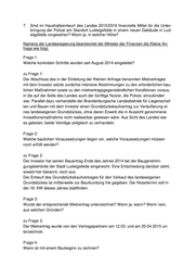 7. Sind im Haushaltsentwurf des Landes 2015/2016 finanzielle Mittel für die Unter- bringung der Polizei am Standort Ludwigsfelde in einem neuen Gebäude in Lud- wigsfelde vorgesehen? Wenn ja, in welcher Höhe? Namens der Landesregierung beantwortet der Minister der Finanzen die Kleine An- frage wie folgt: Frage 1: Welche konkreten Schritte wurden seit August 2014 eingeleitet? zu Frage 1: Der Abschluss des in der Einleitung der Kleinen Anfrage benannten Mietvertrages mit dem Investor setzte zunächst intensive Abstimmungen zu den erforderlichen bau- lichen Maßnahmen sowie zu den mietvertragsgegenständlichen Konditionen voraus, in die auf der Seite des Landes auch der künftige Nutzer, die Polizei, einzubinden war. Parallel dazu verhandelte der Brandenburgische Landesbetrieb für Liegenschaf- ten und Bauen mit dem Investor einen Grundstückskaufvertrag zur Veräußerung ei- nes landeseigenen Grundstückes, ohne deren Erwerb die in Aussicht genommene Investitionsmaßnahme nicht realisierbar gewesen wäre. Aus Sicht des Landes war es geboten, beide Verträge zeitgleich zu verhandeln. Frage 2: Welche baulichen Voraussetzungen liegen vor, welche Voraussetzungen müssen noch erfüllt werden? zu Frage 2: Der Investor hat seinen Bauantrag Ende des Jahres 2014 bei der Baugenehmi- gungsbehörde der Stadt Ludwigsfelde eingereicht. Eine Entscheidung darüber steht, soweit hier bekannt, noch aus. Der Entwurf des Grundstückskaufvertrages für den Verkauf des landeseigenen Grundstückes ist mittlerweile zur Beurkundung frei gegeben. Der Notartermin soll in der 18. KW dieses Jahres stattfinden. Frage 3: Wurde der entsprechende Mietvertrag unterzeichnet? Wenn ja, wann? Wenn nein, aus welchen Gründen? zu Frage 3: Der Mietvertrag wurde von den Vertragspartnern am 12.03. und am 20.04.2015 un- terzeichnet. Frage 4: Wann ist mit einem Baubeginn zu rechnen?